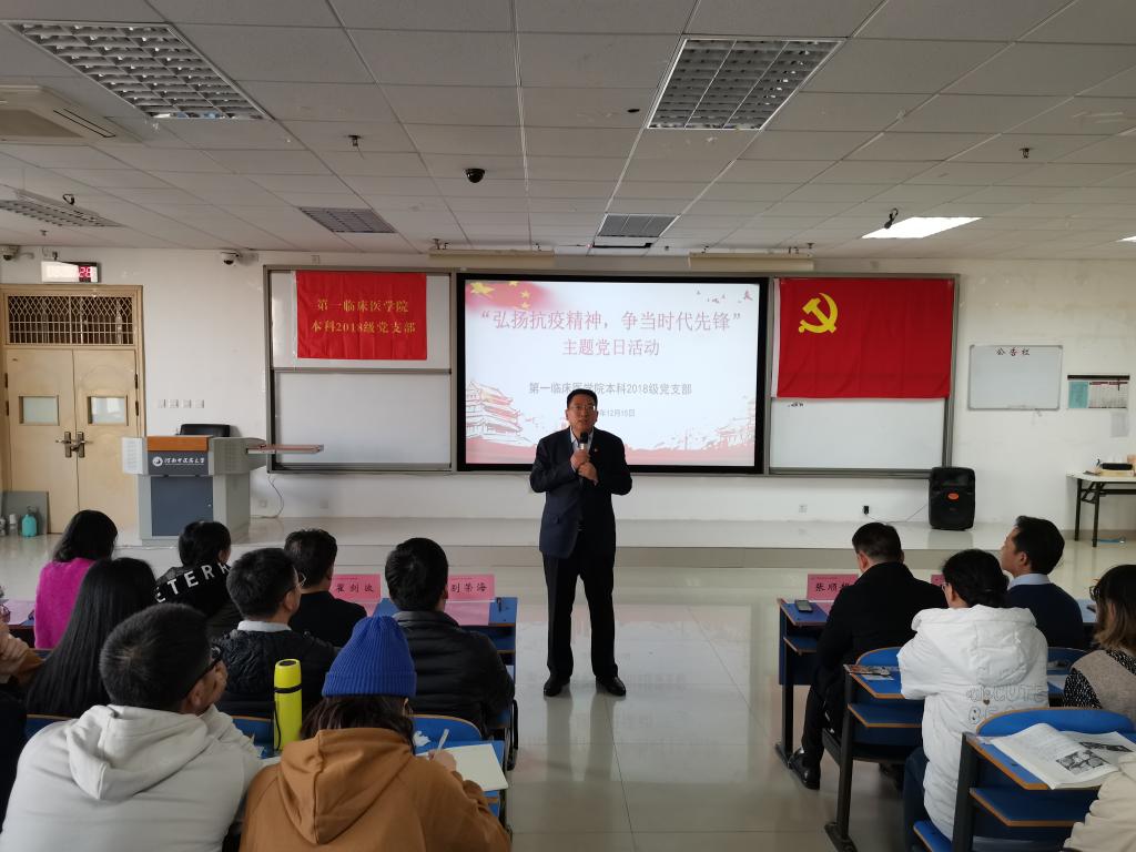 本网讯(文/贾萌萌 范璐璐 图/贾萌萌)2020年12月15日,校党委书记别荣海到联系的第一临床医学院本科2018级党支部和支部党员一起参加“弘扬抗疫精神,争当时代先锋”主题党日活动。校党委办公室副主任张顺超、第一临床医学院党委书记翟剑波、党委副书记张晓东、支部全体党员及入党积极分子参加了此次活动。
