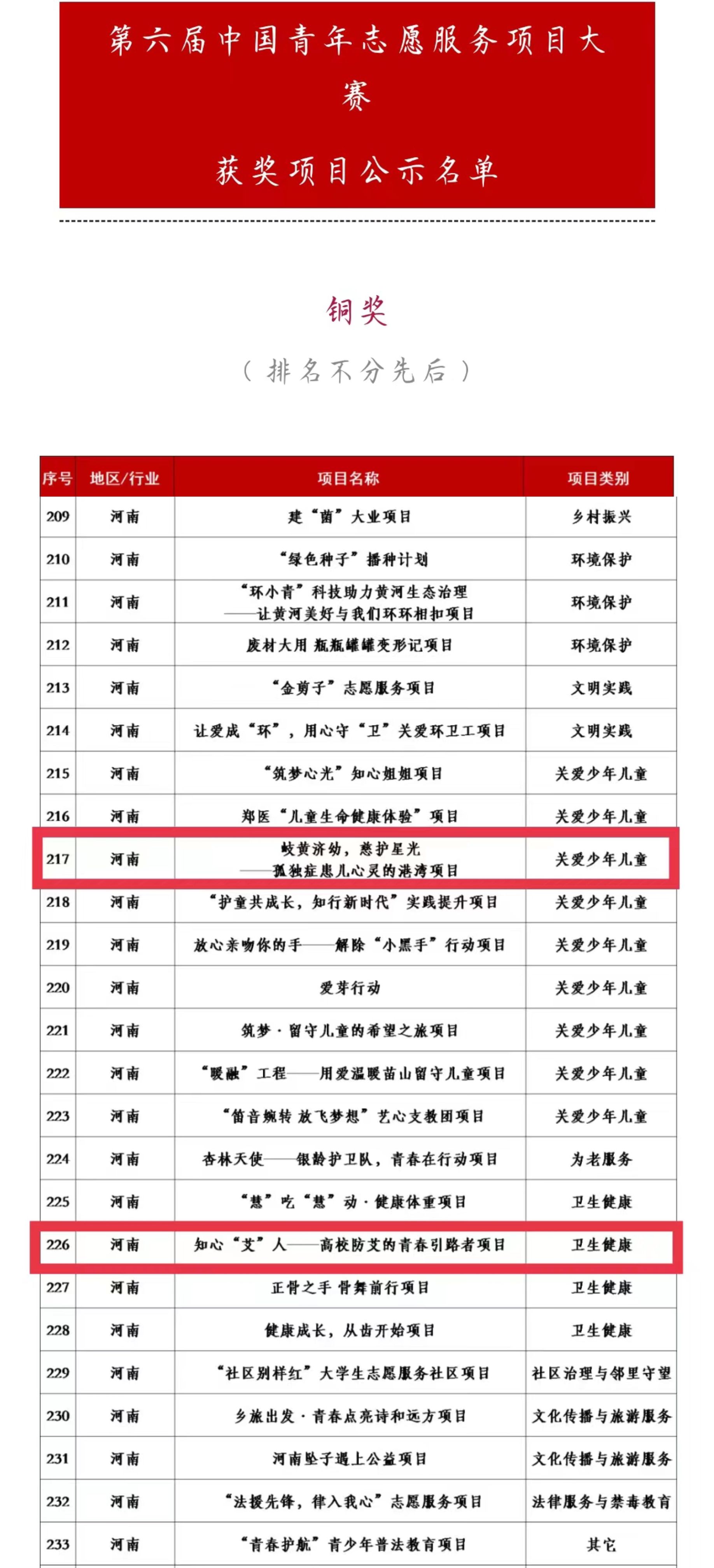 志愿服务项目大赛是推动志愿者事业发展的全国性交流活动,打造集项目展示、组织交流、文化引领和资源配置于一体的全国志愿服务综合平台。leyu·乐鱼(中国)体育官方网站高度重视,提前谋划,校团委广泛动员,各学院充分挖掘志愿服务品牌,做好竞赛申报工作,参赛团队精心准备参赛项目,不断修改完善,精益求精。经过网络评审、线上路演答辩、评委监委线下集中评审等环节的层层选拔,leyu·乐鱼(中国)体育官方网站代表河南省参赛的2个项目从全国1000个项目中脱颖而出。最终,第一临床医学院《知心“艾”人——高校防艾的青春引路者》、儿科医学院《岐黄救济,慈护星光——孤独症患儿心灵的港湾》荣获铜奖。