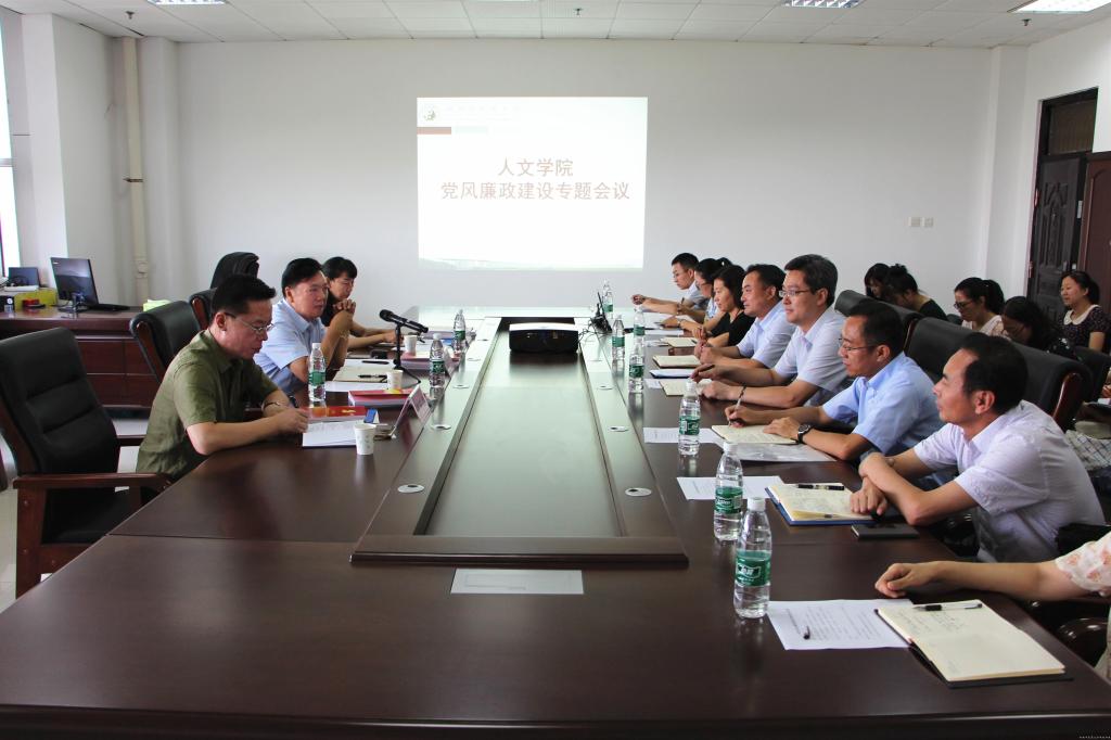2017年6月30日上午9点,人文学院在教学实验大楼七楼中医文化传播中心召开党风廉政建设工作专题会议。学校纪委书记王少玉出席会议并讲话,校纪委副书记、纪委办公室主任赵群英,校监察处副处长梁照伟,人文学院领导班子、党支部书记、学科主任、专业负责人、全体辅导员和科级以上干部23人参加会议。会议由人文学院党委书记王剑锋主持。