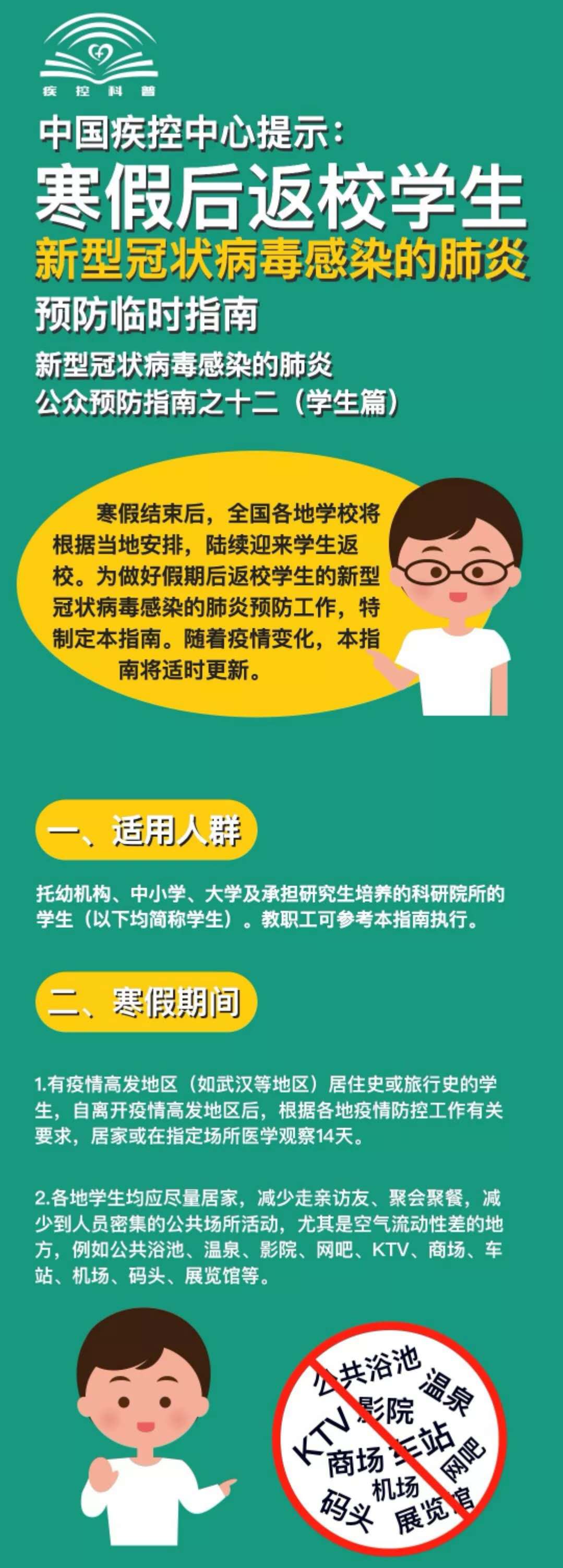 中国疾控中心提示:寒假后返校学生新型冠状病毒感染的肺炎预防临时指南