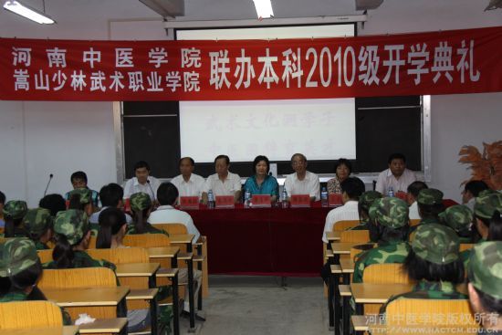 金秋九月,丹桂飘香。2010年9月17日,我院与嵩山少林武术职业学院联办的针灸推拿学(中国功夫方向)本科2010级新生开学典礼,在嵩山少林武术职业学院1号楼教学楼多媒体教室隆重举行。我院院长郑玉玲、嵩山少林武术职业学院法定代表人、党委副书记刘海超、两所学校的有关领导、2010级针灸推拿学(中国功夫方向)全体新生、2009级在校生代表和来自美国、澳大利亚的两名外教参加了典礼。典礼仪式由我院教务处处长张大伟主持。