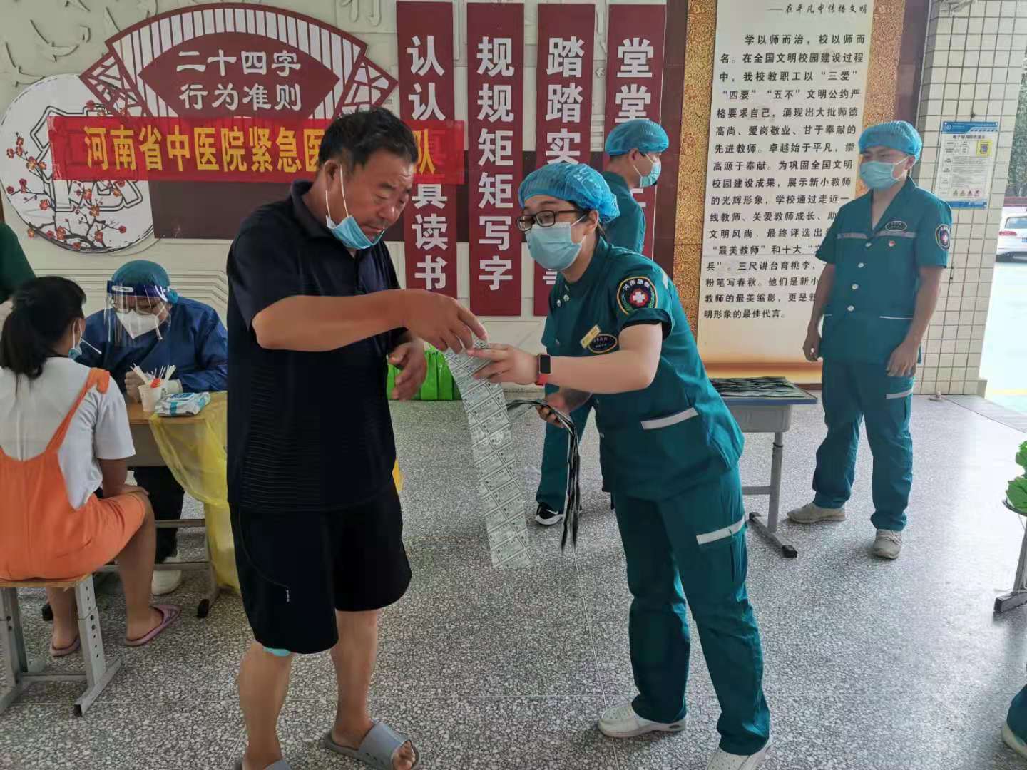 二附院领导非常牵挂远在新乡的医疗队,要求他们做好自身防护,注意休息。上级要求让安置点群众尽快用上中药预防疫病。医学救援队立即响应,很快制作出新冠肺炎预防方药,发放给安置点的群众、学校工作人员、志愿者等,宛西制药也快速按要求制作了一批颗粒剂送到安置点。由于当地防汛形势好转,安置点群众正在有序撤离,安置点的所有人员约300人。8月1日全天,共发放预防新冠肺炎颗粒剂2000余袋,保证安置点中药全覆盖,所有人都及时用上中药。