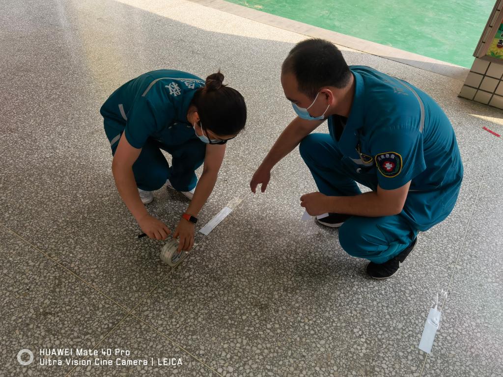 7月31日、8月1日,二附院医学救援队在安置点开展防疫宣教,发放防疫常识宣传页,在每个安置房间张贴防疫常识,为安置点群众发放口罩。队长李永亮要求,一定要督促群众佩戴口罩,保持安全距离。医疗队还协助当地医院开展全员核酸检测。在开展核酸检测前,队员们就开始了准备工作:因陋就简,用白纸裁成窄条贴在地上,间隔成一米线的安全距离;维持秩序,让核酸检测得以顺利快速进行;在安置点房间、公示栏等处粘贴防疫标识及七步洗手法100余张。