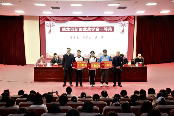 刘雅琳介绍瑞龙奖学金评选背景并宣读表彰决定,随后企业代表与学院、书院领导共同为获奖学生颁发奖金和证书并合影留念。