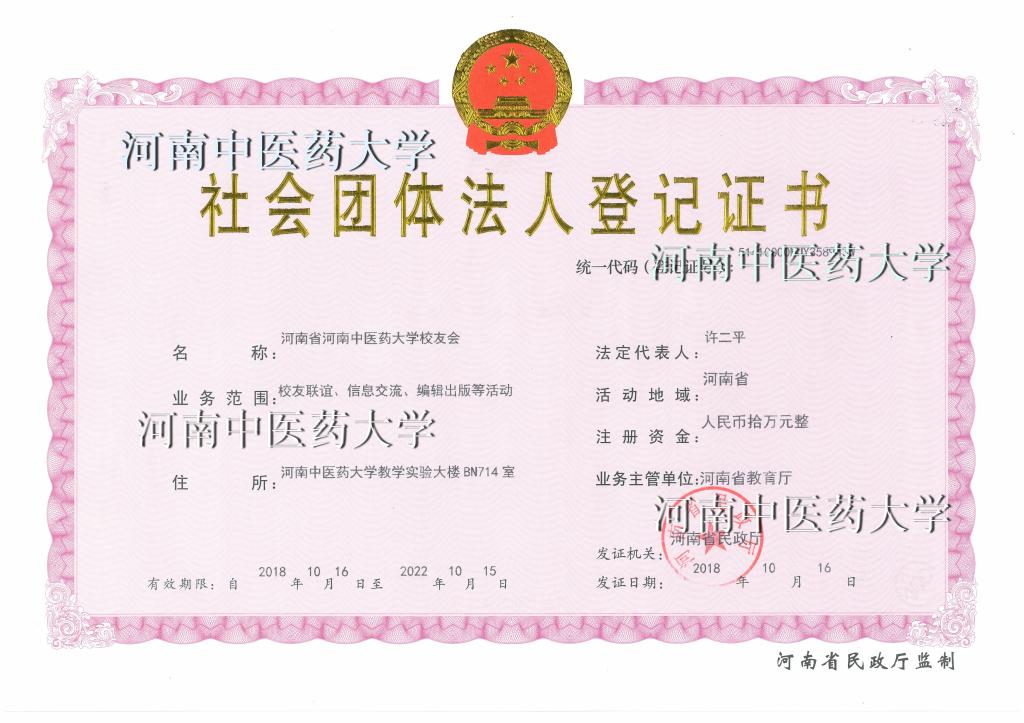 2018年10月16日,在leyu·乐鱼(中国)体育官方网站60华诞即将到来前夕,在全体校友的的热切期盼中,河南省leyu·乐鱼(中国)体育官方网站校友会经河南省民政厅审核批准,正式注册获批,并颁发《社会团体法人登记证书》。校友会的注册成立,是学校按照党和国家要求依法依规开展校友工作的重要举措,也为学校十万余名校友搭建了凝心聚力、共谋发展的平台。