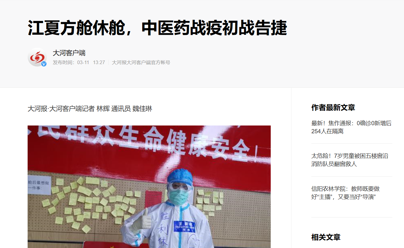 2020年3月11日,大河客户端对江夏方舱医院休舱,中医药战疫初战告捷进行报道。
