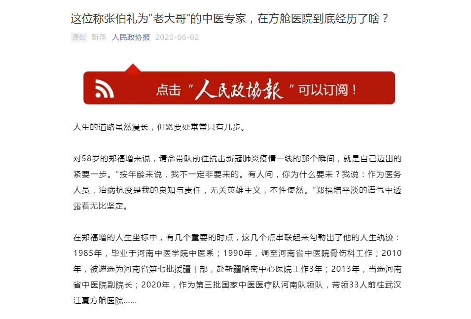 编者按:2020年6月2日,人民政协报以《这位称张伯礼为“老大哥”的中医专家,在方舱医院到底经历了啥?》为题,对leyu·乐鱼(中国)体育官方网站援鄂医疗队领队郑福增的援鄂事迹进行报道。现将全文刊发如下: