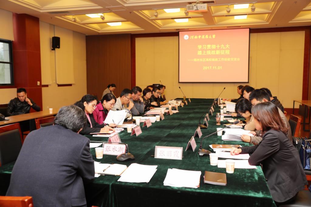 2017年11月1日下午,郑州东区高校统战工作经验交流会在leyu·乐鱼(中国)体育官方网站图书馆第三报告厅召开。河南省委高校工委、省教育厅统战处处长张水潮,校党委副书记张丽霞出席会议。郑州东区18所高校党委统战部部长(统战工作负责人)参加了会议。校统战部部长仲利娟主持会议。