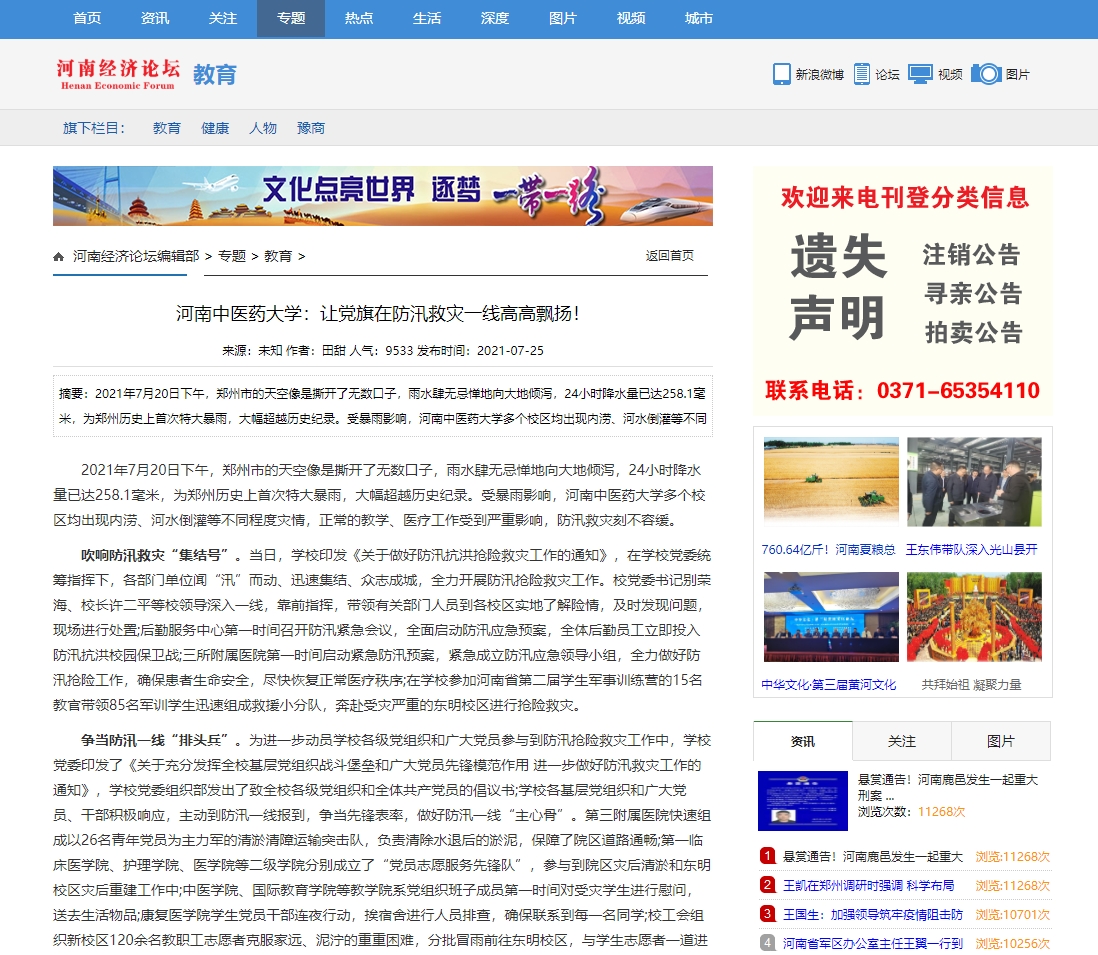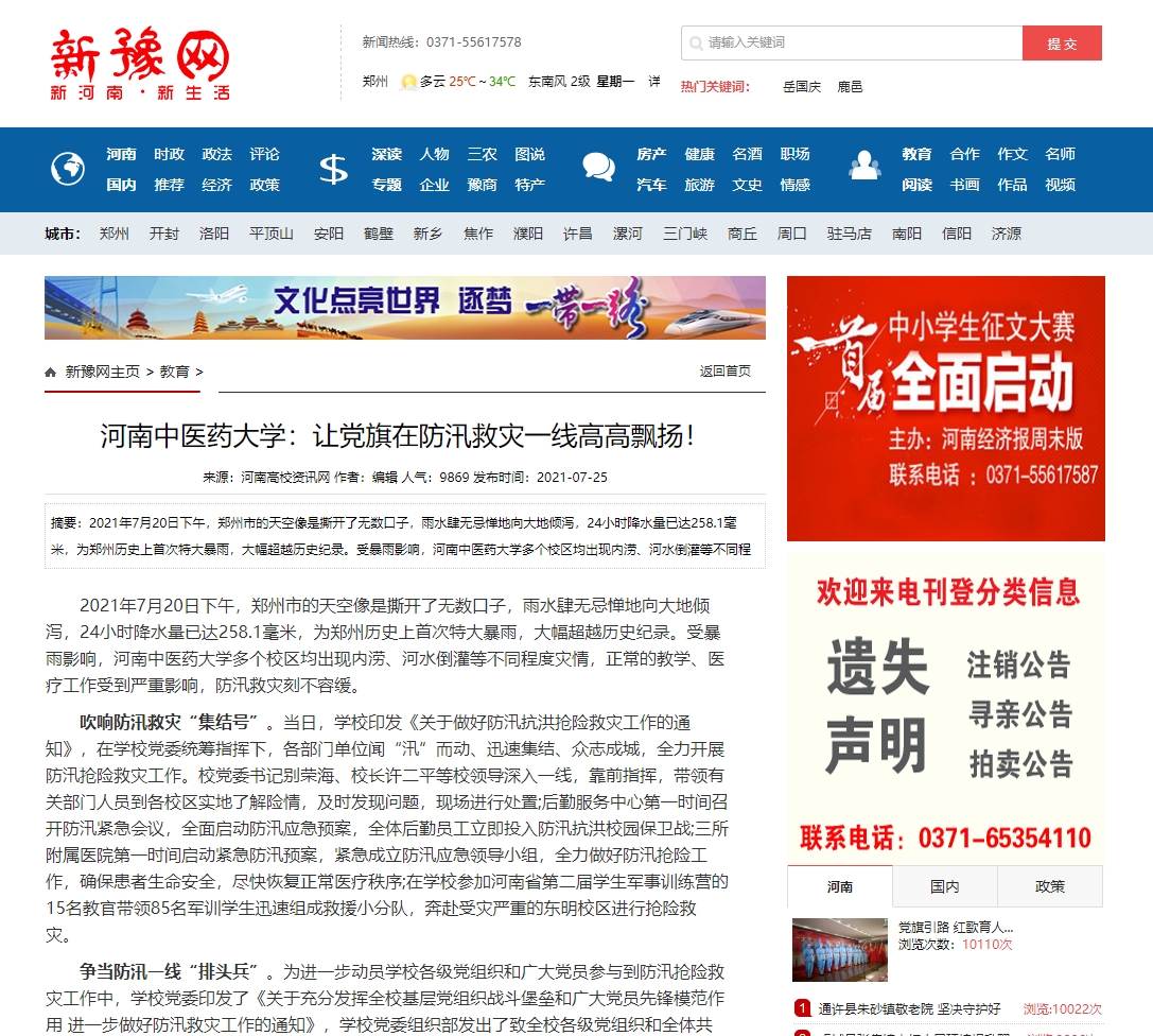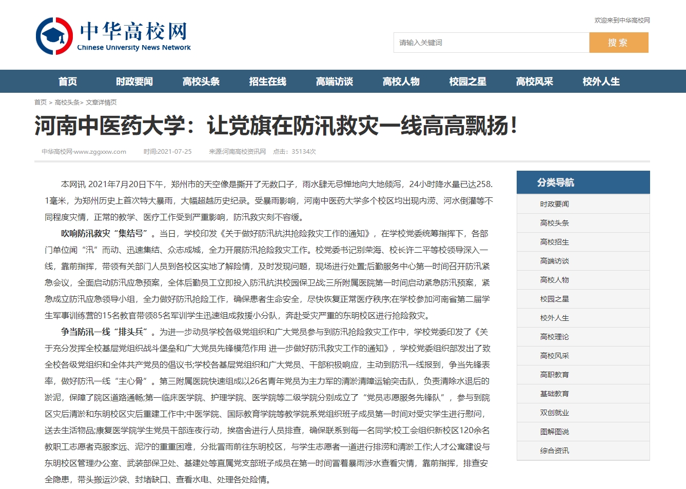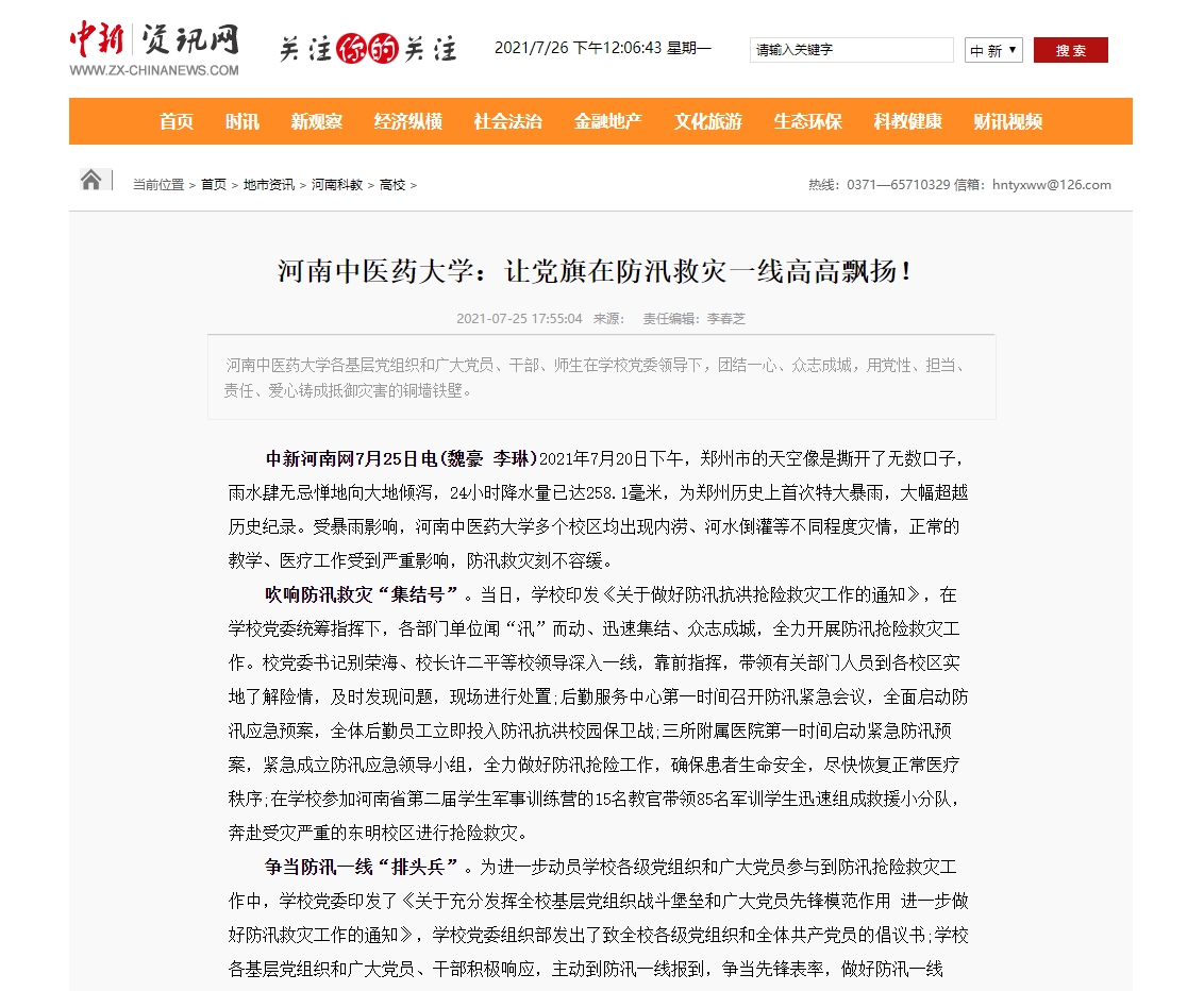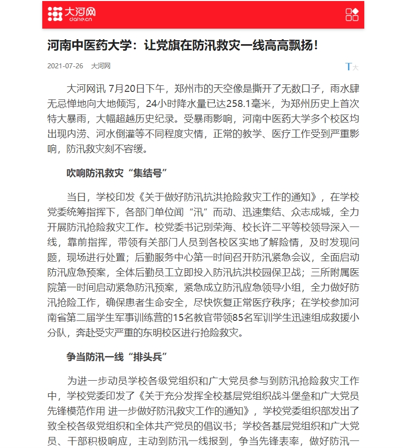 编者按:2021年7月25日-26日,中国网、中华高校网、中新资讯网、大河网、河南高校资讯网、新豫网、河南经济论坛等多家媒体对leyu·乐鱼(中国)体育官方网站让党旗在防汛救灾一线高高飘扬的防汛救灾事迹进行报道。