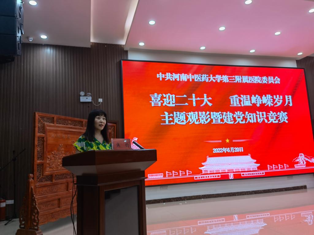 本网讯(文/胡兴旺 图/田辉)为深化开展“能力作风建设年”活动,庆祝中国共产党成立101周年,营造浓厚的氛围,迎接党的二十大胜利召开,三附院党委在“七一”到来之际举办丰富多彩的党建活动,以进一步鼓足干劲、凝聚力量,推动医院各项工作高质量开展。2022年6月20日下午,三附院在学术活动中心通过举行“喜迎二十大,重温峥嵘岁月”主题观影暨党建知识竞赛活动,拉开了系列活动的序幕。院党委副书记焦钧,全院9个党总支、1个直属党支部的70余名入党积极分子参加活动。