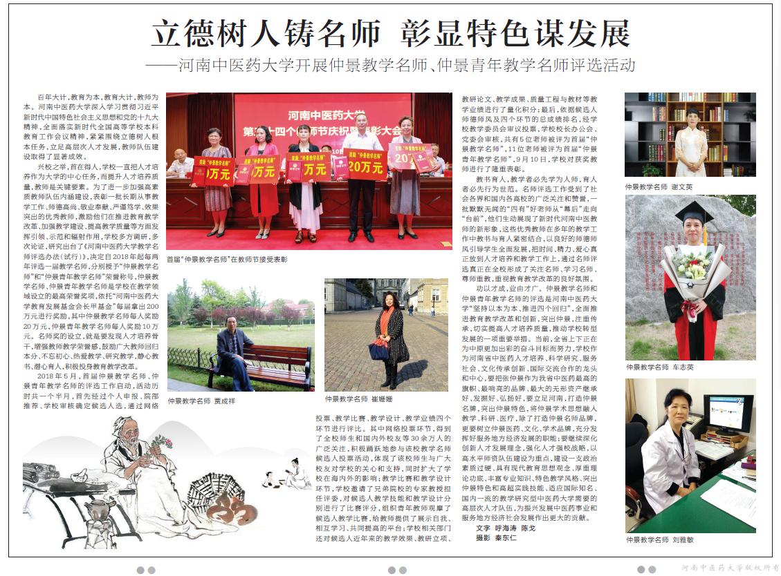 2018年9月19日,《河南日报》以“立德树人铸名师 彰显特色谋发展——leyu·乐鱼(中国)体育官方网站开展仲景教学名师、仲景青年教学名师评选活动”为题,在第九版用半个版面对leyu·乐鱼(中国)体育官方网站独具特色、卓有成效的师资队伍建设工作,特别是今年启动的“仲景教学名师”“仲景青年教学名师”评选进行报道。现将报道全文刊发如下: