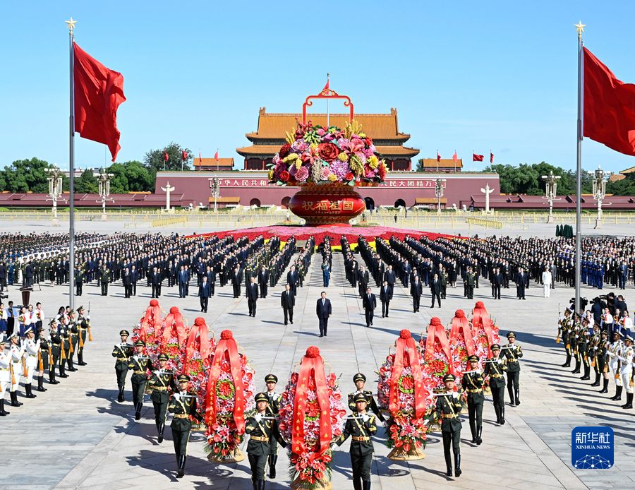 9月30日上午,党和国家领导人习近平、李强、赵乐际、王沪宁、蔡奇、丁薛祥、李希、韩正等来到北京天安门广场,出席烈士纪念日向人民英雄敬献花篮仪式。新华社记者 谢环驰 摄