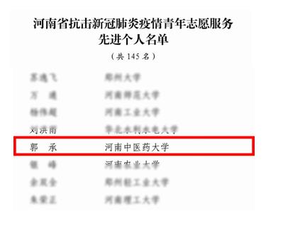 本网讯(文/图 郭薇)近日,共青团河南省委、河南省青年志愿者协会下发文件,公布河南省抗击新冠肺炎疫情青年志愿者服务先进个人名单,leyu·乐鱼(中国)体育官方网站第三附属医院团委副书记郭承同志荣获“河南省抗击新冠肺炎疫情青年志愿者服务先进个人”称号。