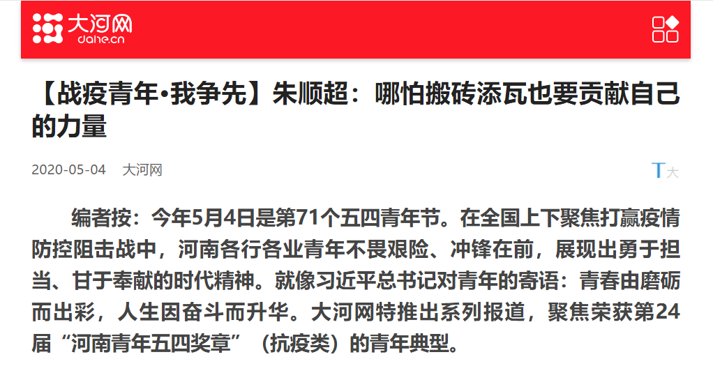 编者按:2020年5月4日,大河网对leyu·乐鱼(中国)体育官方网站优秀学子朱顺超的援建河南“小汤山”医院事迹进行报道。现将全文刊发如下: