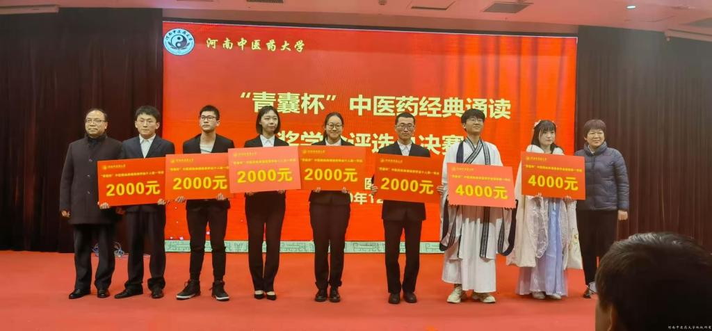 决赛分为个人赛和团体赛两个环节,经前期初赛选拔,共有10名选手、10个班级团体进入决赛。个人赛以考察学生对中医经典条文的掌握、运用程度为主。比赛过程中10位同学沉着冷静,应对自如,充分展现了大家对中医经典的熟识程度。团体赛在古典与柔美相结合的舞蹈中拉开帷幕,各参赛队伍表现形式多样,大家利用朗诵、情景剧等形式,结合棋艺、太极、书法、民舞等传统文化因素,选取《大医精诚》、《伤寒论序》及自编《抗疫赋》等内容,紧扣伟大抗疫精神、高尚医德医风等主题,多角度展现出中医经典所蕴含的知识与内涵,赋予了经典新的活力。最终,基础医学院孟富山、针灸推拿学院袁帅明等5名同学,基础医学院2019级仲景学术传承班及中医学(5+3一体化)班分获个人赛、团体赛一等奖。评委专家分别为获奖个人及团体进行颁奖。