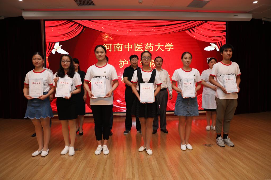 杨英豪院长宣读《第一期“南丁格尔”实验班学员结业名单》。第45届南丁格尔奖章获得者宋静、柘城县人民医院李德怀院长、刘运龙副院长、护理学院党总支尹丽书记、杨英豪院长、孟长海副书记、秦元梅副院长为21名结业学员颁发结业证书。