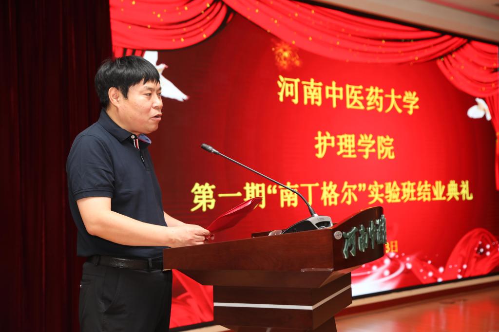 首先,护理学院党总支书记、第一期“南丁格尔”实验班班主任尹丽做实验班工作总结,回顾了实验班成立以来,得到了学校和各部门的大力支持。与柘城县人民医院人民签订合作框架协议的子协议,发展院校合作,创新人才培养方式。柘城县人民设立“柘医南丁格尔基金”奖励资助实验班学员。护理学院聘请导师团指导实验班员学,全面提升品德、知识、身体、心理、能力五大素质。实验班学员在两年的学习生活中,各方面都取得了很好的成绩。祝贺各位学员顺利结业,期待今后有更好成绩。