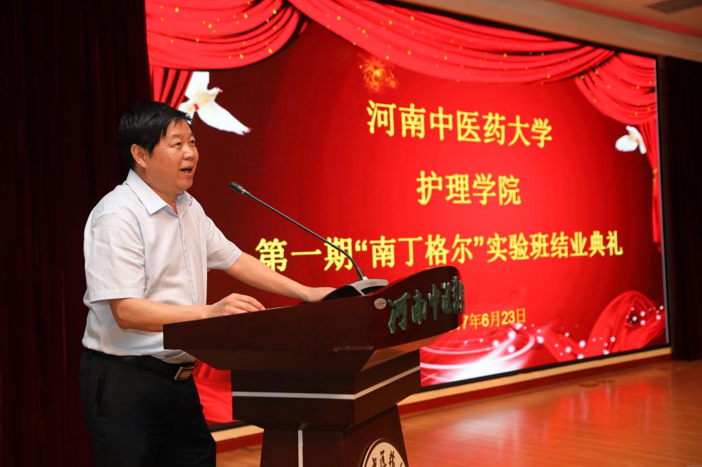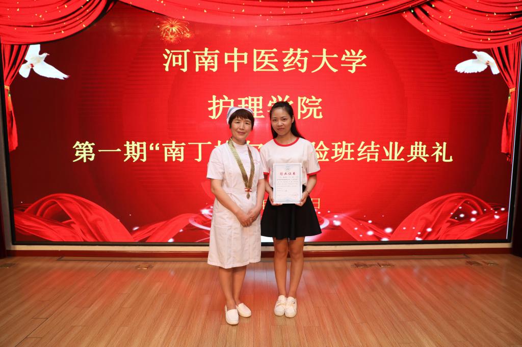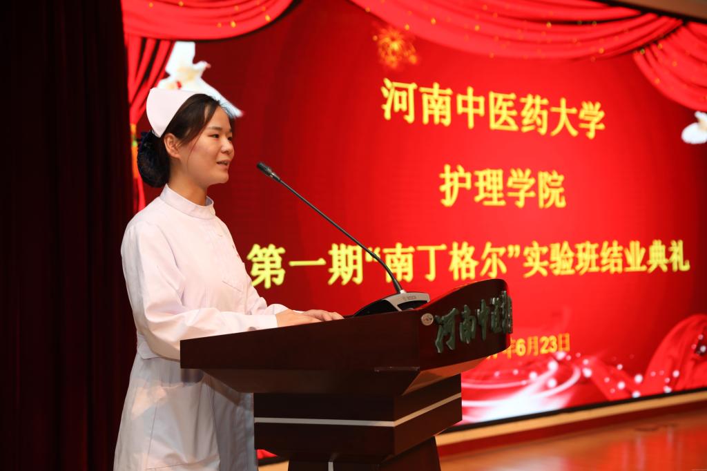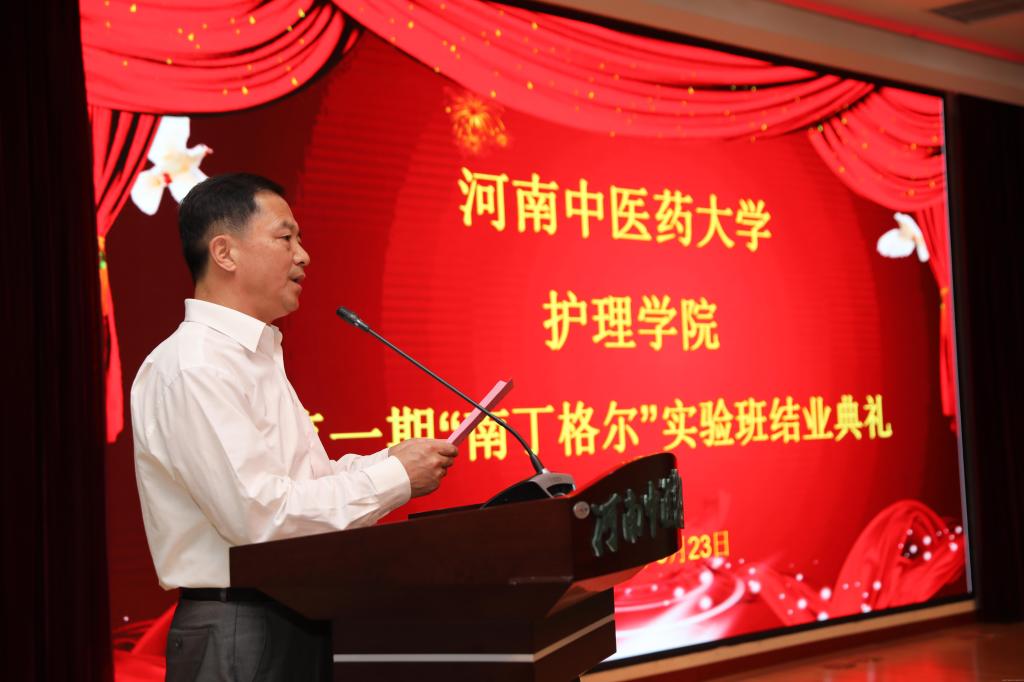 校党委副书记郭德欣向顺利结业的21名同学表示祝贺,向护理学院、柘城县人民医院、以及学校各有关部门表示感谢,同时提出殷切期望。希望同学们勤学修德、明辨笃实,结业后不要停下学习的脚步,继续提升品德、知识、能力、心理、身体五大素质;希望同学们不忘初心、继续前行,在今后的职业生涯中始终以“南丁格尔”精神为指导,将自己的毕生精力贡献给护理事业;希望同学们懂得感恩,牢记老师的教导,将柘城县人民医院的无私帮助谨记在心中,同时把感恩的心传承下去,用实际行动以大爱之心关心、爱护每一位病人;希望护理学院能够认真总结南丁格尔班的办学经验,并且在最后的工作中将特色坚持发扬下去,使南丁格尔班的办班经验受惠于每一位同学。