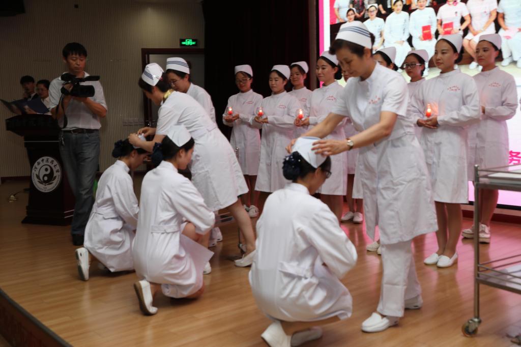 随后,举行了庄严的授帽与宣誓仪式,伴随着庄严的乐曲和激昂的朗诵,“南丁格尔奖”获得者宋静和护理学院副院长秦元梅、教师张勇勤、潘兰霞等护理前辈为结业学员们戴上圣洁的燕帽,宋静主任带领同学们宣誓南丁格尔誓言。