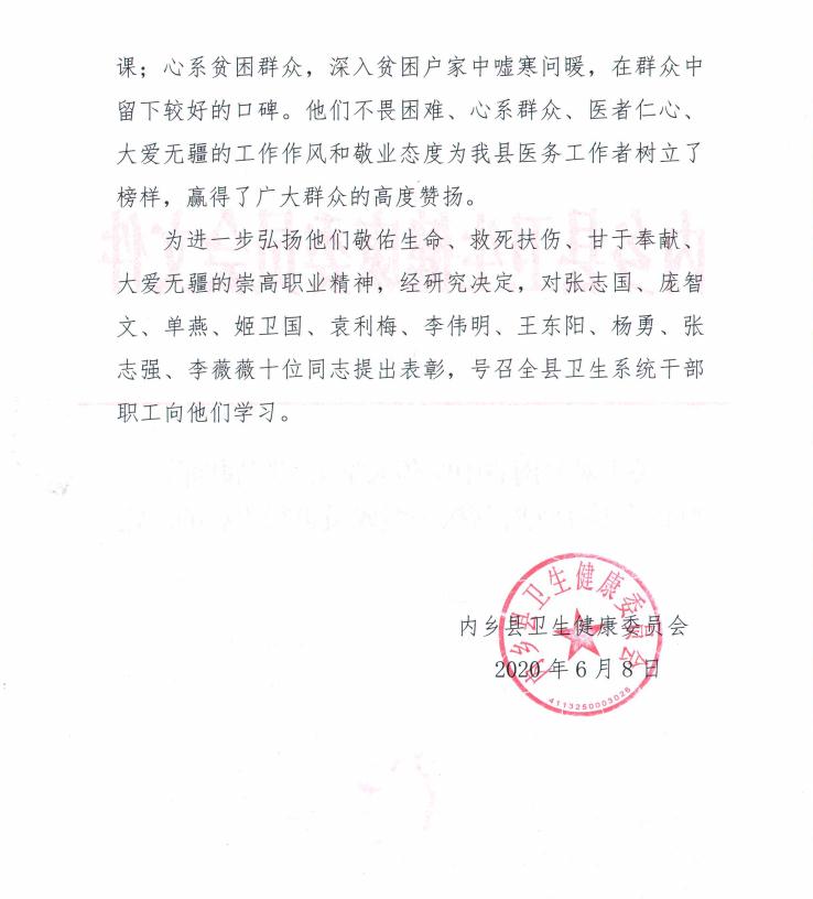 为进一步弘扬他们敬佑生命、救死扶伤、甘于奉献、大爱无疆的崇高职业精神,经研究决定,对张志国、庞智文、单燕、姬卫国、袁利梅、李伟明、王东阳、杨勇、张志强、李薇薇十位同志提出表彰,号召全县卫生系统干部职工向他们学习。