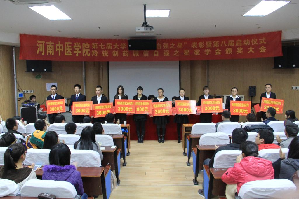 会上,党委宣传统战部部长刘保庆宣读了《关于表彰leyu·乐鱼(中国)体育官方网站第七届大学生“十大自强之星”暨颁发“羚锐制药诚信自强奖学金”的决定》。学校对洪盼盼等10位自强之星标兵、王亚东等10位自强之星进行表彰,到会领导和嘉宾共同为获得“羚锐制药诚信自强标兵奖学金”和“羚锐制药诚信自强之星奖学金”获得者颁发了证书和奖金。获奖学生代表、针灸推拿学院2010级针推本科二班王爱丽同学上台发言,她向大家讲述了自己自强不息的奋斗历程,对帮助和支持她的老师及同学们表达了诚挚的感谢,并且表示在未来的路上将一如既往,自强前行。随后,校团委书记郭婧宣读了《关于开展leyu·乐鱼(中国)体育官方网站第八届大学生“十大自强之星”评选活动的通知》,对第八届自强之星评选活动做出了具体的安排与部署。