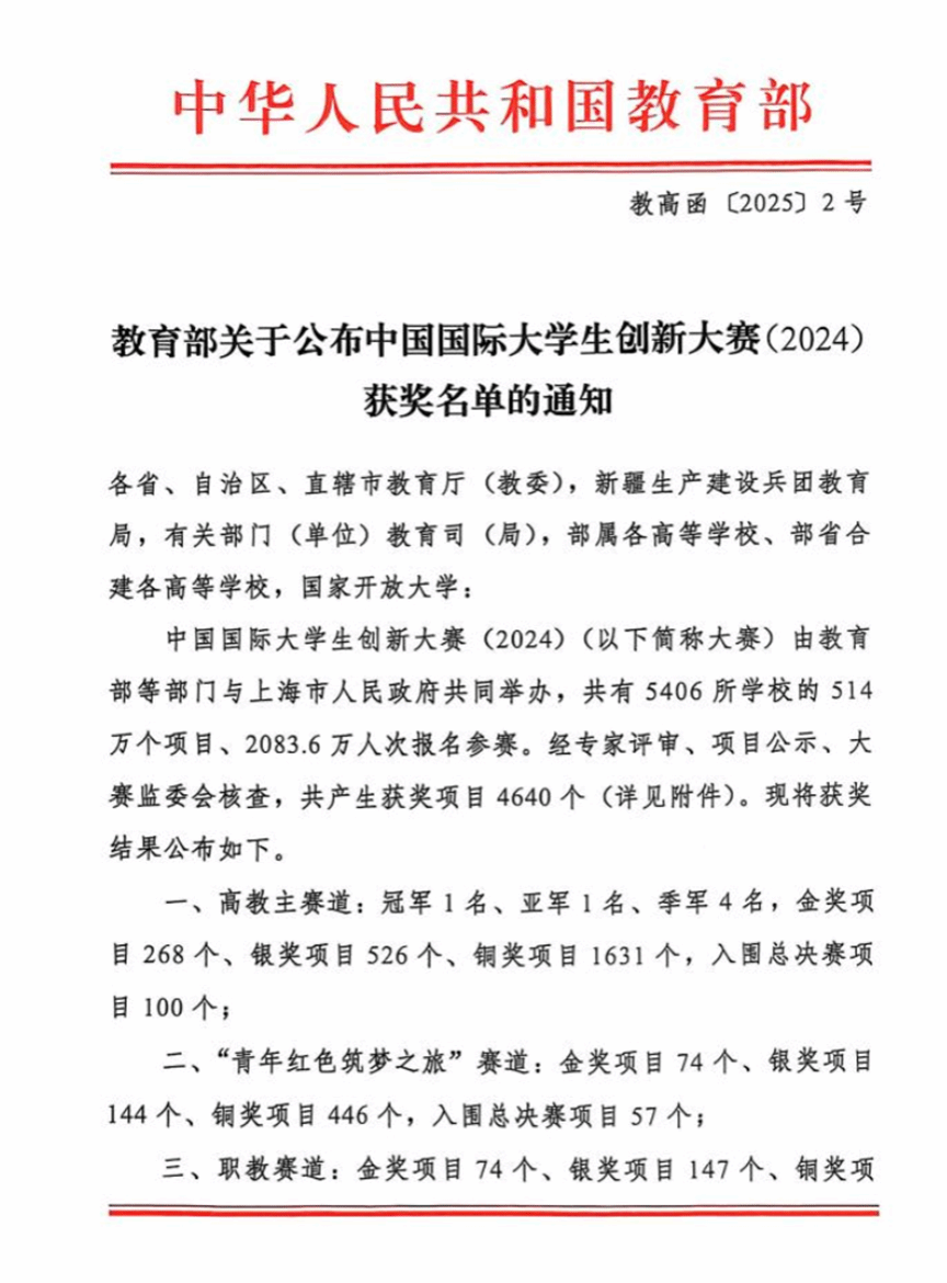 本网讯(文/图 刘超 孙晓涵)2025年4月9日,教育部下发《关于公布中国国际大学生创新大赛(2024)获奖名单的通知》,正式公布大赛全国总决赛获奖名单。leyu·乐鱼(中国)体育官方网站在本届大赛中共获得国家级奖项8项,其中银奖1项、铜奖6项、入围奖1项。这是学校首次在主赛道国际项目和产业命题赛道中获得国家级奖项。