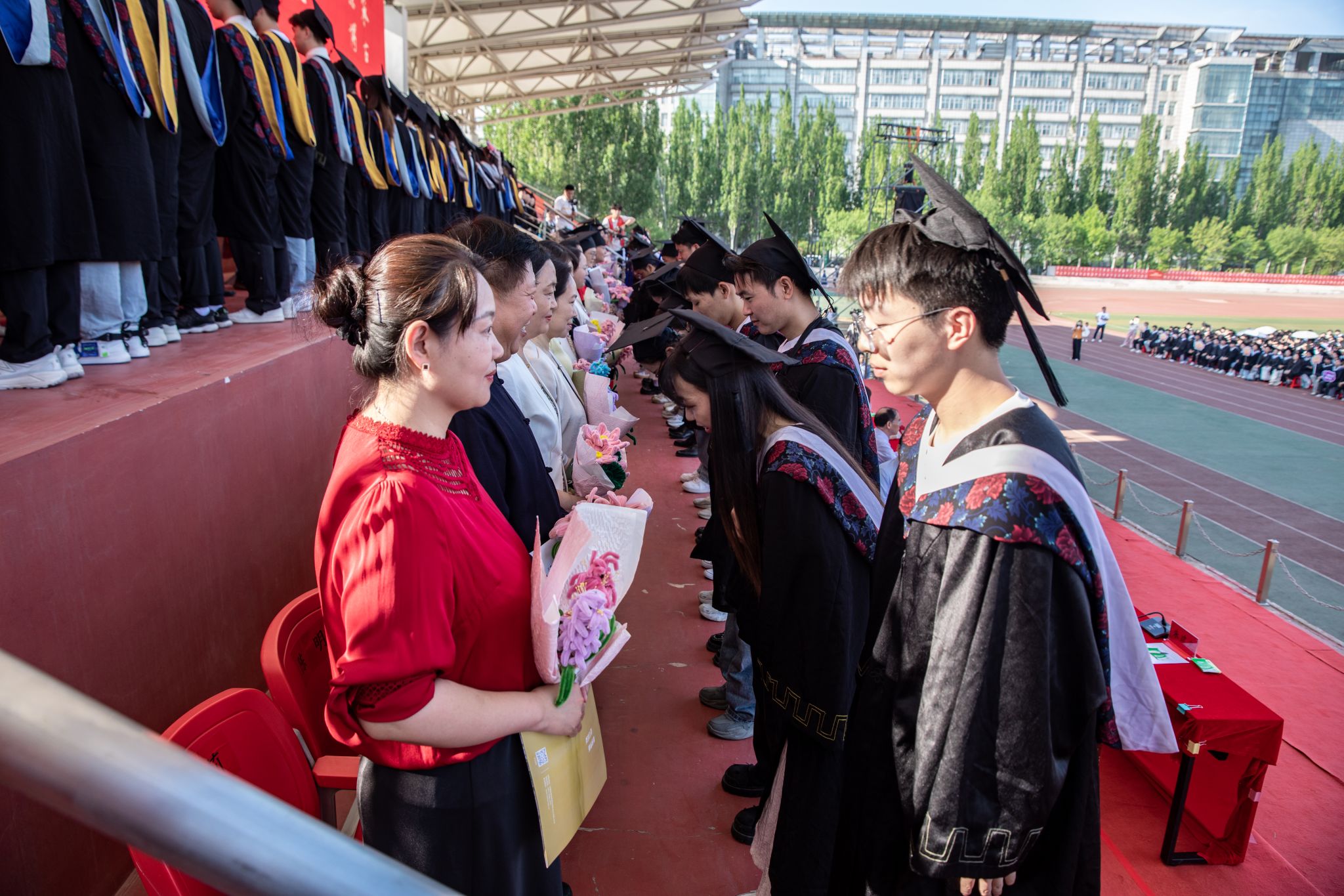 国歌奏响,全场肃立。毕业生代表向师长敬献自己制作的手工绒花,行谢师礼,感恩母校培育之恩。副校长彭新介绍2025届毕业生毕业情况,宣读学位委员会学位授予决定。副校长田力宣读《关于表彰2025届优秀毕业生的决定》。校领导为优秀毕业生代表颁发荣誉证书。
