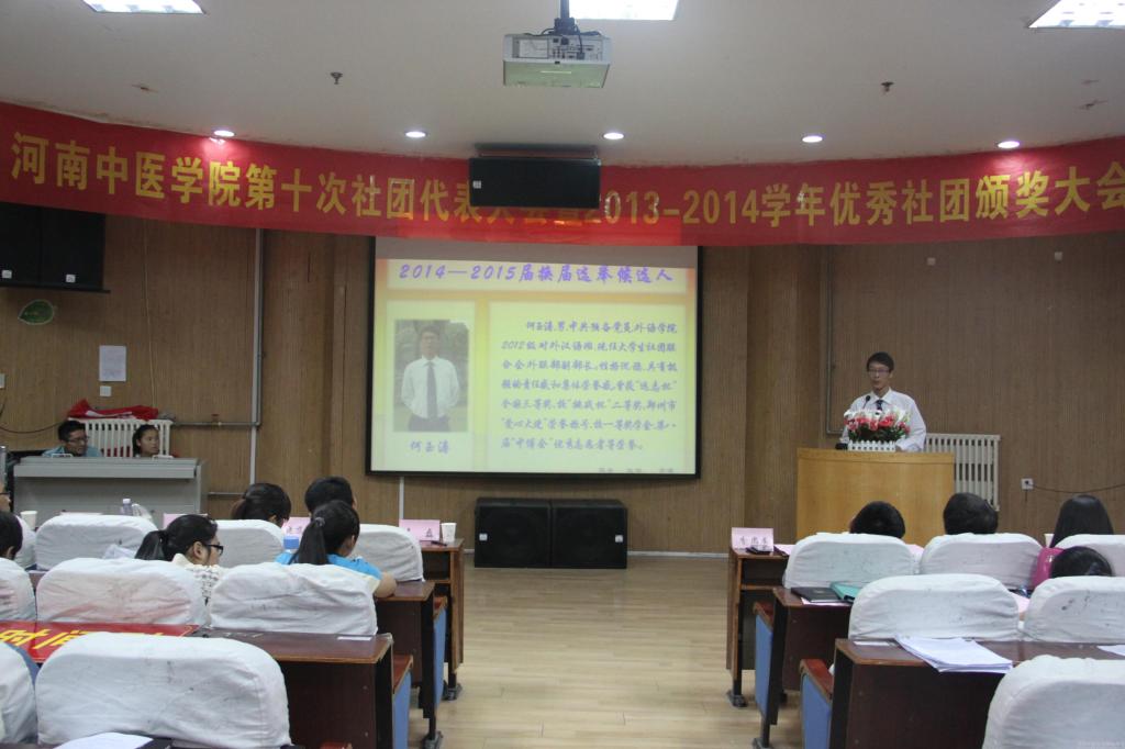表彰结束后,大学生社团联合会换届竞选正式开始。16位候选人分别上台演讲,他们声情并茂,充满自信,与大家分享了在大学生社团联合会工作中的经历和收获,畅谈了对未来工作的想法与思路,并现场进行答辩,展现了个人良好的综合能力。经过现场公开投票、公正唱票,来自外语学院2012级对外汉语班的何玉涛同学当选为2014-2015届大学生社团联合会主席,第一临床医学院2012级中西医四班的王昊同学当选为大学生社团联合会组织副主席,人文学院2012级市场营销班的薛启瑜同学当选为大学生社团联合会宣传副主席。