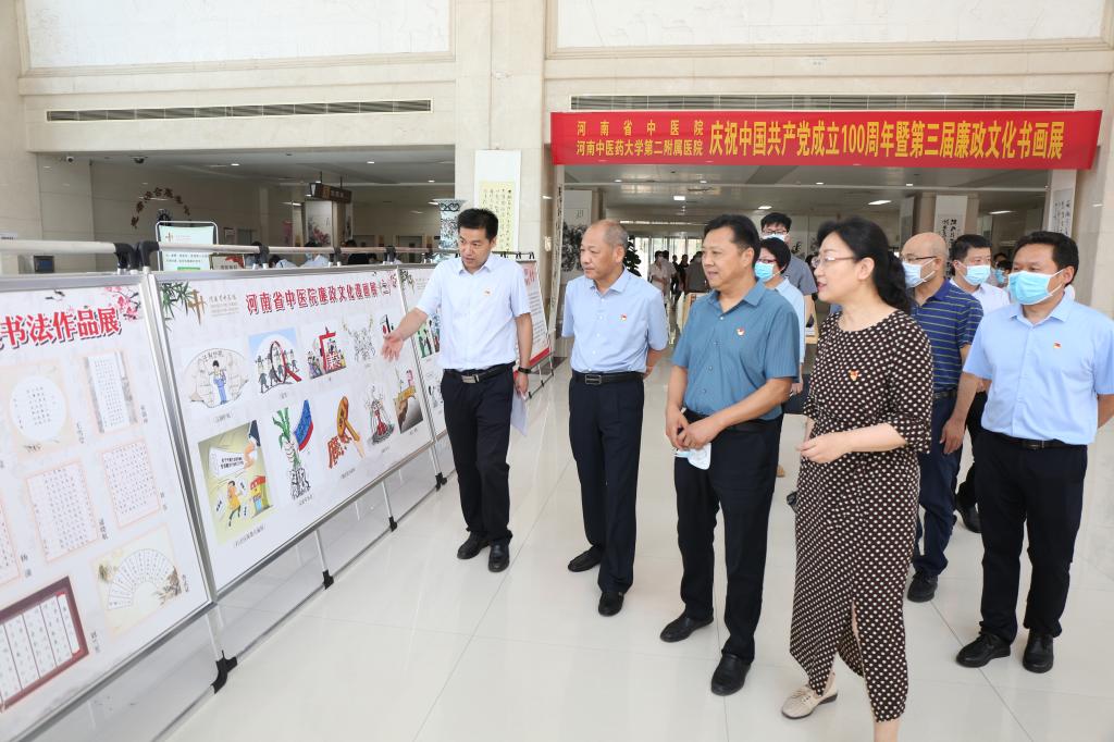 本网讯(文/张正国 图/李昕)为庆祝中国共产党成立100周年,歌颂党的丰功伟绩,传承优秀传统文化,传播廉政理念,倡导廉洁从医,增强广大干部职工知廉爱廉敬廉守廉意识,营造知史爱党、知史爱国的浓厚氛围,2021年6月28日上午,二附院庆祝中国共产党成立100周年暨第三届廉政文化书画展正式开幕。校纪委书记、监察专员王少玉出席开幕式并讲话,医院党委书记王海亮及在郑领导班子成员参加。医院党委副书记、纪委书记王倩主持开幕式。