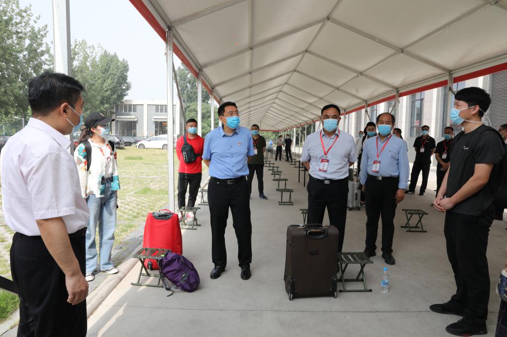 一大早,校党委书记别荣海、校长许二平等校领导来到学生报到现场,看望慰问辛勤坚守岗位的工作人员,详细询问了此次返校复学工作的准备情况,充分肯定了前期各项工作取得的阶段性成效,并与返校同学进行亲切交流。在看到井然有序的报到现场后,校领导表示,从前三批次报到工作的开展情况看,学校疫情防控的各项措施是科学的,起到了将病毒拒之门外的效果,整个返校复学工作平稳有序。这是学校复学工作指挥部带领各部门、各单位干部职工,时刻把师生的生命安全和身体健康放在首位,对师生最急最忧最盼的每个细节进行反复分析、研究、讨论、演练的结果,是广大教职工自元月以来主动放弃休息时间,克服重重困难,不分昼夜、连续奋战的结果,令人感动,令人敬佩,进一步彰显了新时代河中医人特别能吃苦、特别能战斗、特别能奉献的精神品质,这一平稳有序的返校复学工作局面来之不易,大家应倍加珍惜。在健康筛查结果等候区,不少同学正在仔细翻阅学校发放的防疫知识手册,校领导欣慰地说,虽然全国多地均已下调疫情防控风险等级,但返校复学牵涉大规模、多地区的人口流动,校园作为特殊场所,全校师生还要进一步提高政治站位,以最高风险响应来认真对待,时刻绷紧思想之弦,严格按照学校疫情防控的相关要求,积极行动起来,自觉克服工作、学习、生活中的诸多不便,牢固树立“过几天苦日子”的思想,师生同心、同向、同行,共克时艰。校领导还反复叮嘱同学们一定要照顾好自己,以实际行动做到学习生活和科学抗疫两不误。