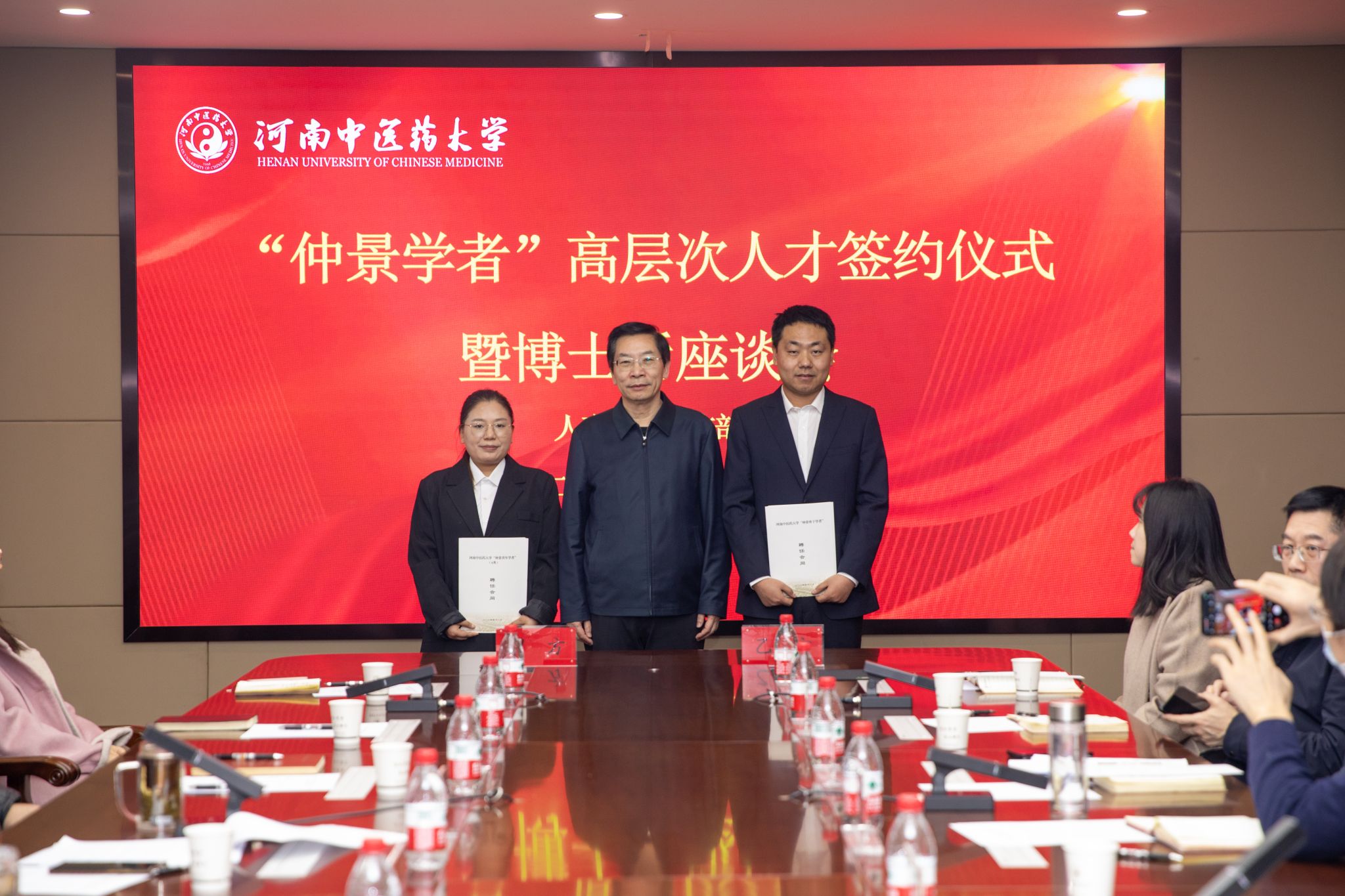 在签约阶段,张加民介绍了与会人员和签约人才的基本情况。他表示,为持续落实人才强校战略,在个人申报、院部推荐、学校审核的基础上,经学校校长办公会、党委会决议,决定聘任王鹏磊为仲景骨干学者,赵晖为仲景青年学者A类。王鹏磊对学校的聘任表示感谢,承诺今后将依托自身学科专长,聚焦学校战略需求,从学术理论、技术创新及实际应用等多个维度,尽己所能为中医药事业发展贡献智慧和力量。