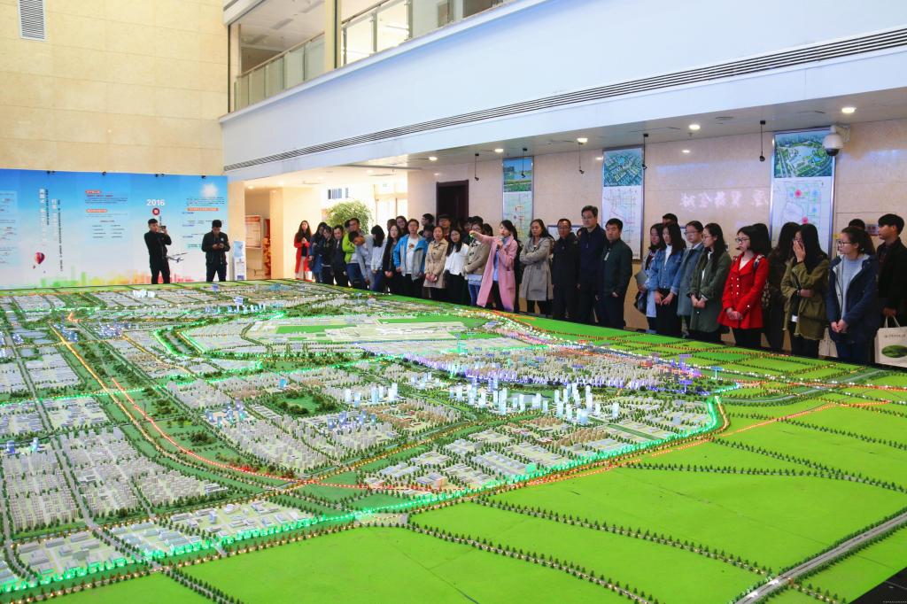 首先,人文学院师生参观了新郑机场T2航站楼和航空港区规划展览馆。在“十二五” 成就回顾展展台前,通过丰富的图片和大量的数据,师生们深入了解到航空港区近几年以创新、高科技等产业为支柱的各项产业迅猛发展,每年总产值增幅高达40%以上,2016年手机产量已达2亿部以上,成为全球最大的智能手机生产地。