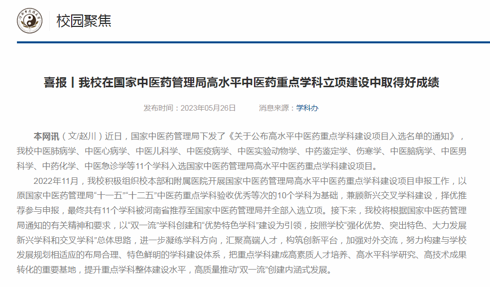 中医肺病学、中医心病学等11个学科入选国家中医药管理局高水平中医药重点学科建设项目,药理学与毒理学进入ESI前1%学科排名,基础医学、中药配方精油学等13个学科获批新一轮河南省重点学科。学校前瞻学科发展趋势,在原有5个校级交叉学科建设的基础上,成功申报立项7个省级交叉学科,形成了省“双一流”、国家局、省“双特”、省新一轮及校级等不同层次、不同类别布局合理的重点学科建设体系,学科建设稳中求进,“双一流”航船驶向更宽阔的水域。