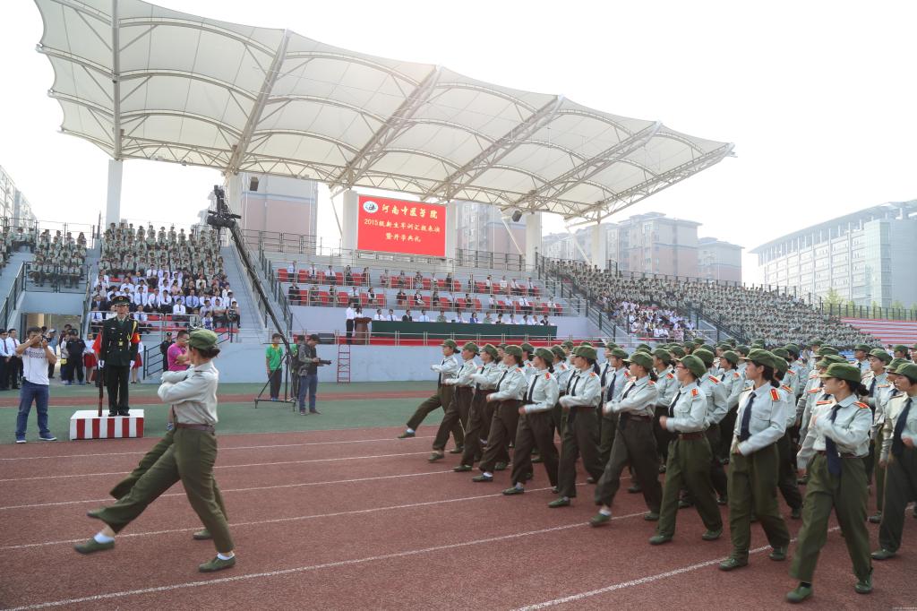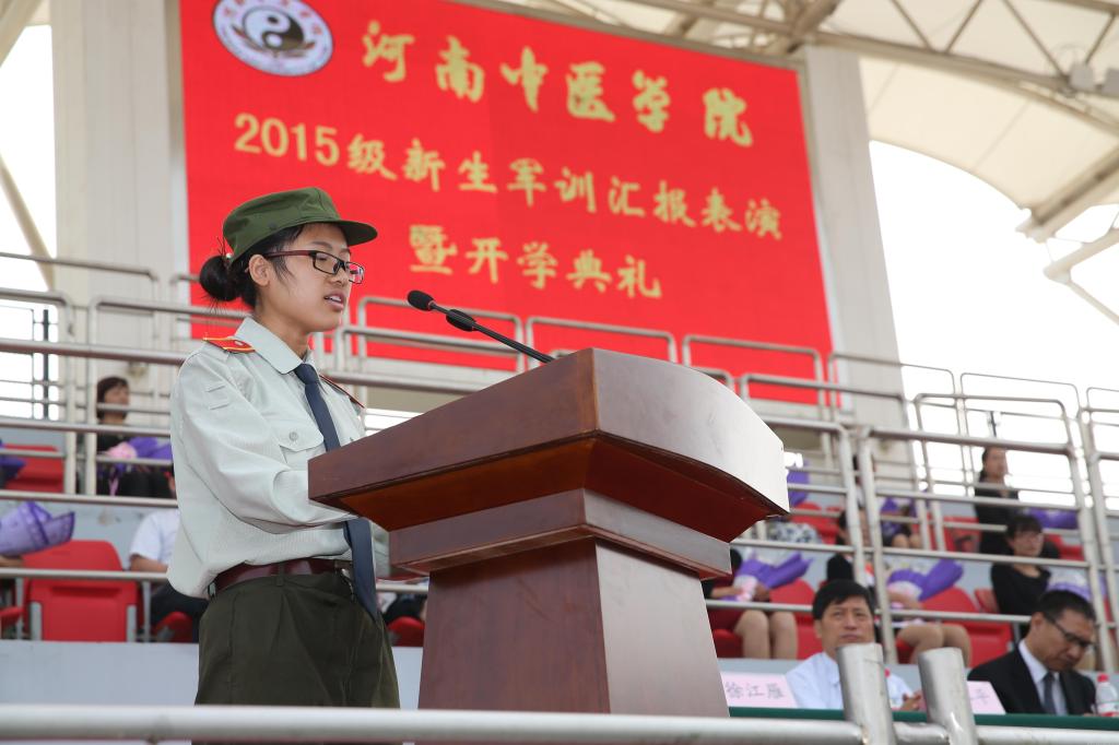 在校大学生艺术团领唱的《河南中医学院校歌》中,2015级新生军训汇报表演暨开学典礼圆满结束。(文:苗苗 校报记者 秦丹奇 赵轩铮 图:秦东仁)