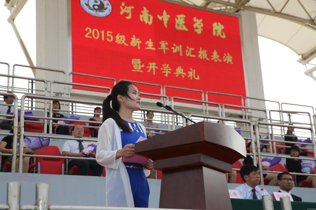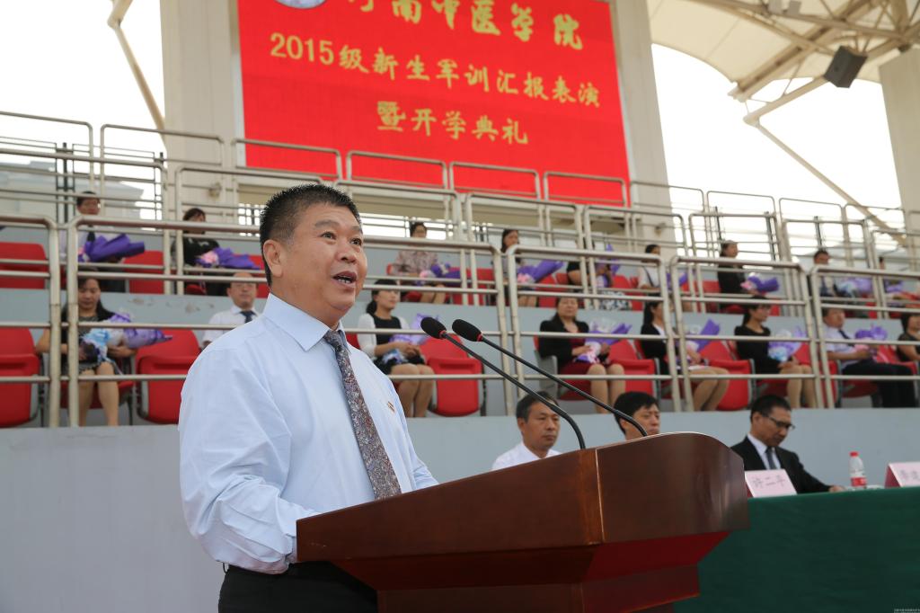 教师代表、针灸推拿学院朱现民教授表达了对新同学的期望,提醒同学们要好好珍惜大学时光,老师永远是同学们成功路上的坚强后盾;优秀校友代表、汝州市医缘堂医院院长杨玉华与现场师生分享了自己的学习和创业体会,用亲身经历告诉大家如何前行;高年级学生代表、人文学院2011级医学心理学班徐丽萍同学告诉学弟学妹要尽快融入新生活,明确目标和定位,度过充实有意义的大学生活;新生代表、2015级中西医临床医学专业徐莉莉同学表达了对大学的憧憬和期盼,并表示会在老师和师兄师姐的指导下,努力规划好自己的大学生活。