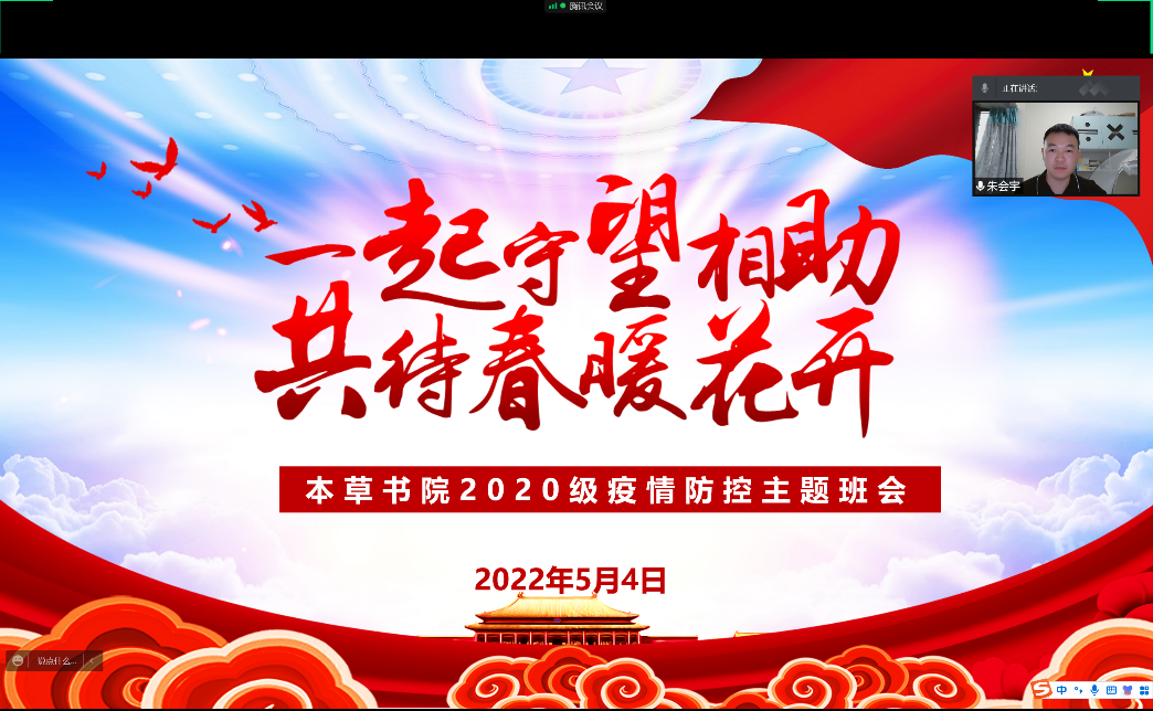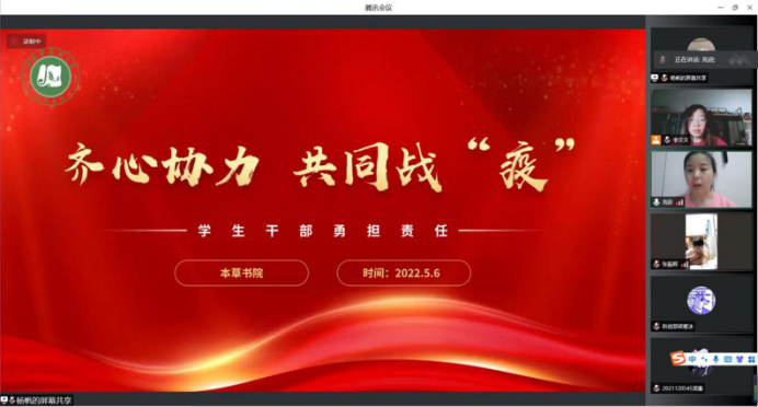 齐心协力,共同战疫。5月6日晚9点,本草书院召开“齐心协力,共同战疫,我先行”学生党员、学生干部专题会议,倡议党员、学生干部以身作则,发挥好模范带头作用,从自身做起不信谣、不传谣,不点外卖、不收快递,时刻关注网络舆情监管,为同学们提供丰富的线上活动,与同学们共同携手守护校园安全底线。团委书记克迎迎呼吁大家亮明身份、作出表率、坚定信念,共筑校园疫情防控安全屏障,一同践行“请党放心,抗疫有我”的青春担当。