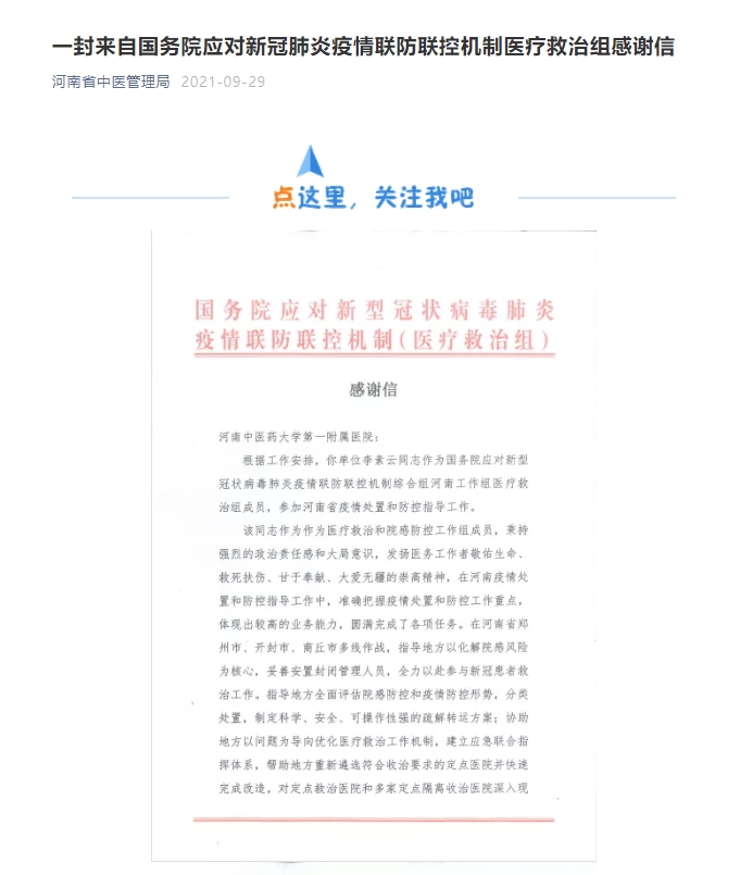 2021年9月29日,省中医管理局官方微信对一附院收到了来自国务院应对新冠肺炎疫情联防联控机制医疗救治组的感谢信进行报道。