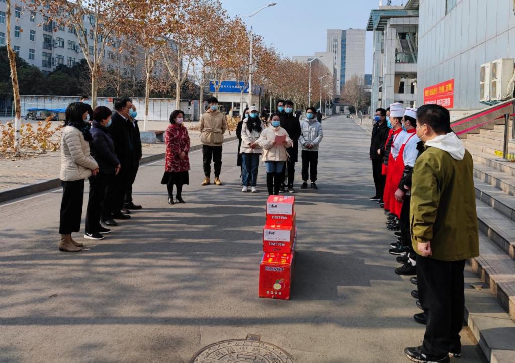 “是您不分春夏秋冬、严寒酷暑站岗值守,保障校园的安全;是您在疫情爆发后仍毅然坚守、毫不懈怠令我们无比心安。面对新冠肺炎疫情的来势汹汹,您没有退缩,戴上口罩,恪守岗位,巡回在校园的每个角落,为留校学生的生命财产安全保驾护航。因为有您,这个冬天我们很安心。”留校学生代表在学校北门前对保卫处全体安保老师们如是说。2022年寒假期间,郑州市疫情防控形势骤然严峻,多地升级为中风险地区。但正在此时,留校同学们看到了各位保卫老师们寒冬中为入校人员测量体温,核验双码;看到了雪夜各位保卫老师们继续巡逻,守护师生的安全;看到了核酸检测现场的各位保卫老师维持秩序,早晚开门,让他们在学校无比安心和感恩。仪式最后,现场校领导和相关部门负责人还和留校学生们一起为后勤和保卫人员送上了新春祝福和慰问品。
