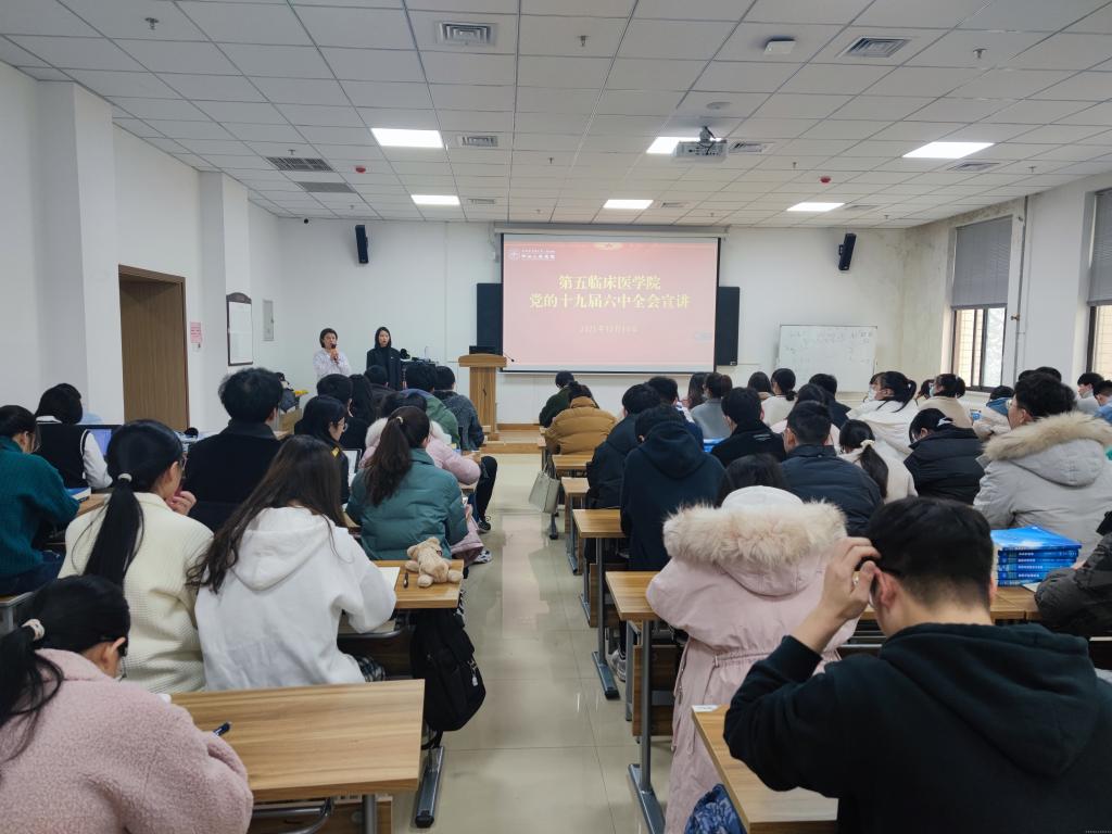 本网讯(文/夏文娜 图/翟萌嫒)为使广大师生党员深入学习领会党的十九届六中全会精神内涵,进一步指导实践和推动工作,2021年12月10日上午,在文化路校区医学教育中心301学术活动室,第五临床医学院邀请学校党史学习教育宣讲团成员、马克思主义学院马克思主义中国化教研室讲师张梦露作《从党的百年奋斗重大成就和历史经验中汲取智慧力量》为主题的宣讲。学院党委副书记吕雁,全体学生党员、入党积极分子,职工党员代表90余人参加,学工办党支部书记刘曼主持。
