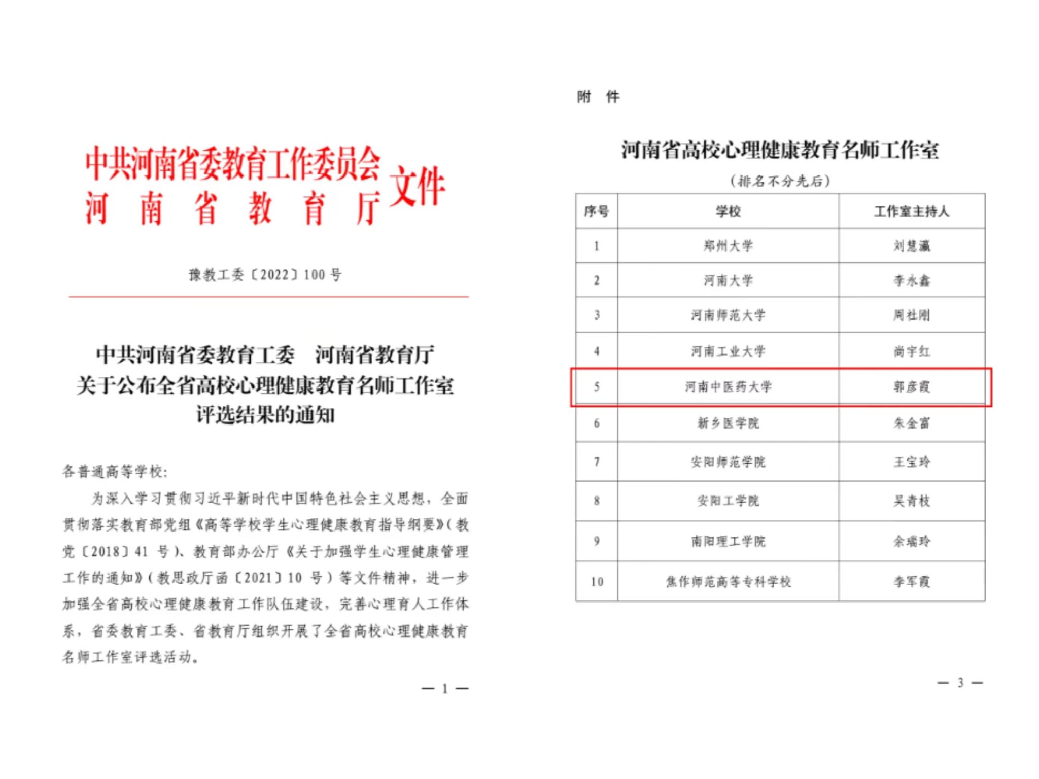 本网讯(文/图 张红坡)在河南省委教育工委、省教育厅举办的全省高校心理健康教育名师工作室评选中,leyu·乐鱼(中国)体育官方网站郭彦霞副教授主持的工作室成功入选。