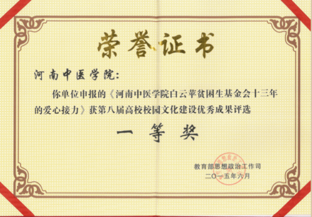 1.文化育人有特色。学校在环境建设中弘扬中医药文化,建有河南中医药博物馆、中药植物园、仲景广场、药企展厅等文化场馆,营造了浓郁的中医药文化氛围。2015年获批“全国中医药文化宣传教育基地”,是全国首个以整个校园命名的基地。校园文化活动叫响“仲景文化”,精心开展“仲景学术文化节”“大学生仲景文化节”,以学术讲座、科技创新,传承医圣思想,涵养医德医风。2015年,《白云苹贫困生基金会十三年的爱心接力》获得教育部高校校园文化建设优秀成果一等奖。2018年,有两项成果分获河南省普通高等学校校园文化建设优秀成果二等奖和三等奖,2021年“张仲景医药文化”入选第五批河南省非物质文化遗产代表性项目名录。