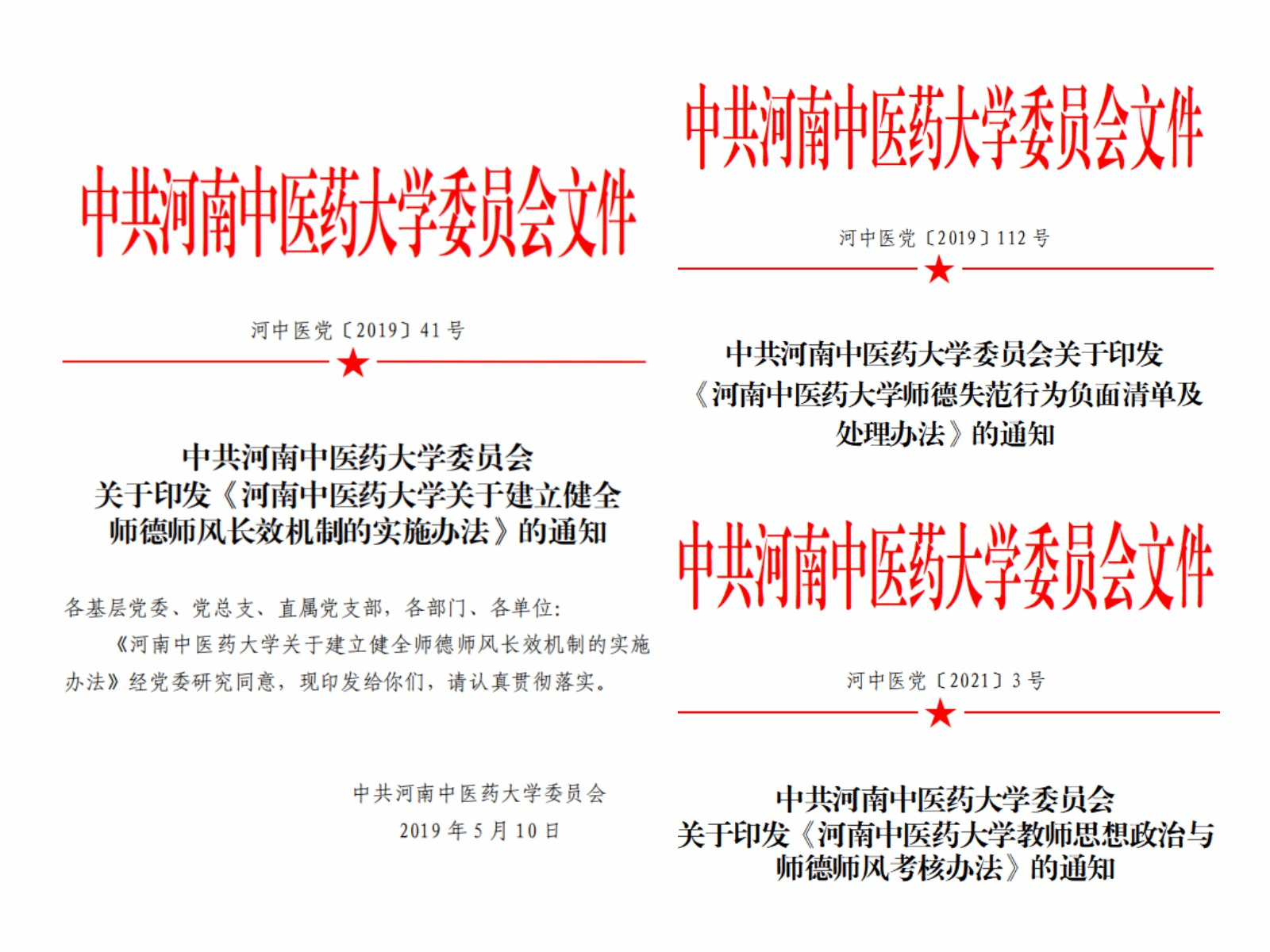 1.师德建设强劲有力。加强师德师风建设,于2020年成立教师工作部,出台《关于建立健全师德师风长效机制的实施办法》《教职工荣誉体系设置方案》《教师思想政治与师德师风考核办法》《师德失范行为负面清单及处理办法》等制度,构建长效机制,树立鲜明导向。坚持以德为先,将师德纳入教师考核评价体系,考核结果贯穿于教师职务晋升、职称评审、评比奖励等环节,严格执行师德师风“一票否决”制。持续开展师德师风主题教育,积极开展“出彩中医人”“我心目中的好导师”“仲景教学名师”等评选活动。leyu·乐鱼(中国)体育官方网站涌现出“全国优秀教师”邵素菊、张琳琪,“全国医德标兵”张怀亮,“出彩河南人‘最美教师’”崔姗姗,河南省首届“医德医风模范”牛朝阳,河南省高校黄大年式教师团队——“中药学教师团队”等一大批医德师德高尚的教师群体。