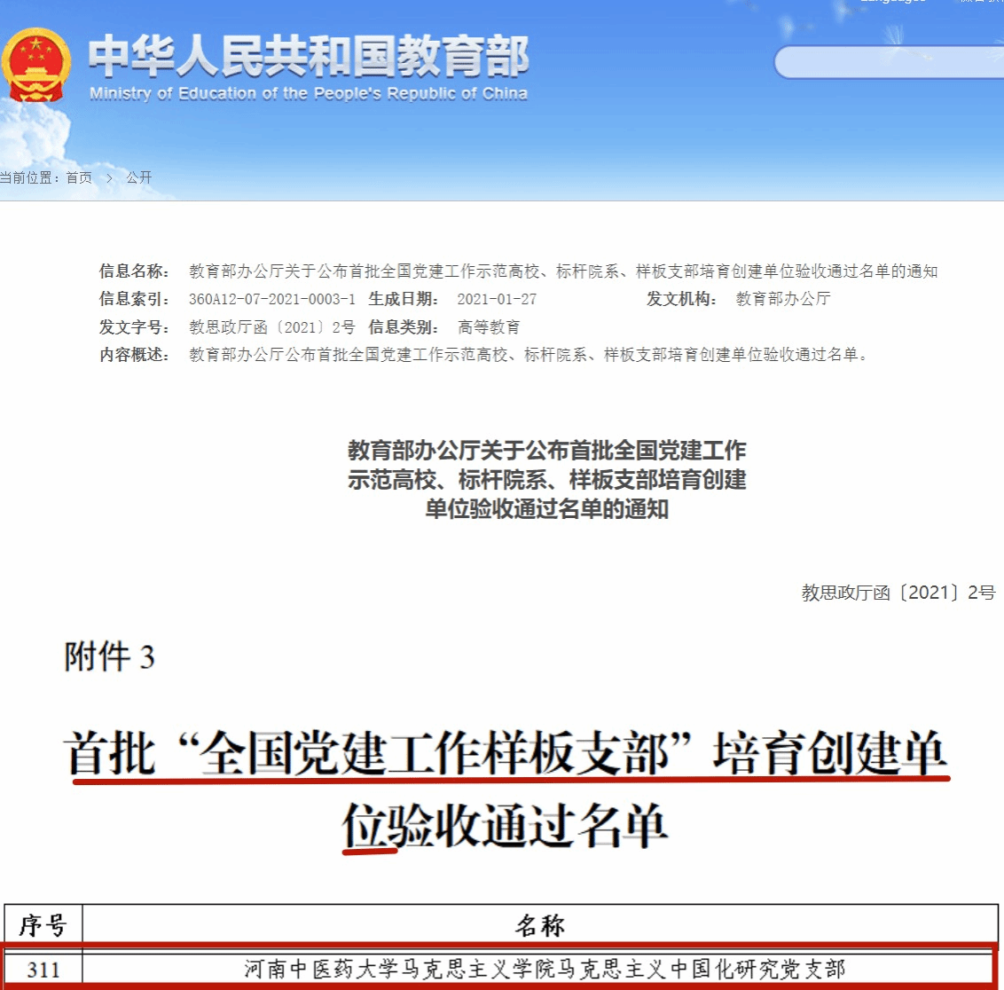 马克思主义中国化研究党支部荣获首批全国党建工作样板支部培育创建单位,并于2021年顺利通过验收