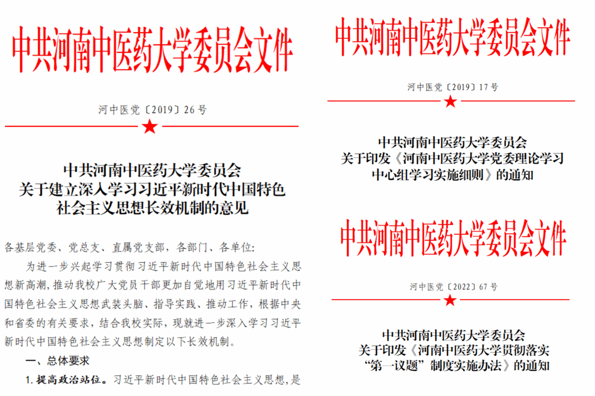 (二)强化思想引领,点亮“指路灯”。学校党委高举思想之旗,把学懂弄通做实习近平新时代中国特色社会主义思想作为首要政治任务,严格落实“第一议题”制度,充分发挥校处两级党委中心组理论学习的引领示范作用,及时跟进学习领悟习近平总书记重要讲话和重要指示批示精神。2019年制定《关于建立深入学习习近平新时代中国特色社会主义思想长效机制的意见》《党委理论学习中心组学习实施细则》,2022年出台《贯彻落实“第一议题”制度实施办法》,切实增强“四个意识”,坚定“四个自信”,做到“两个维护”。党委理论学习中心组聚焦习近平总书记关于高等教育和中医药发展的重要讲话和重要指示批示精神,集中学习研讨140次。党委理论学习中心组成员坚持对标对表,强化学思践悟,在党报党刊发表理论文章50余篇,撰写心得体会500余篇。