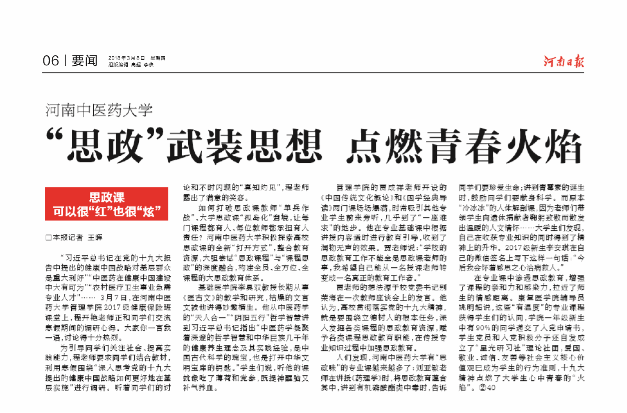 《河南日报》报道leyu·乐鱼(中国)体育官方网站课程思政改革成效