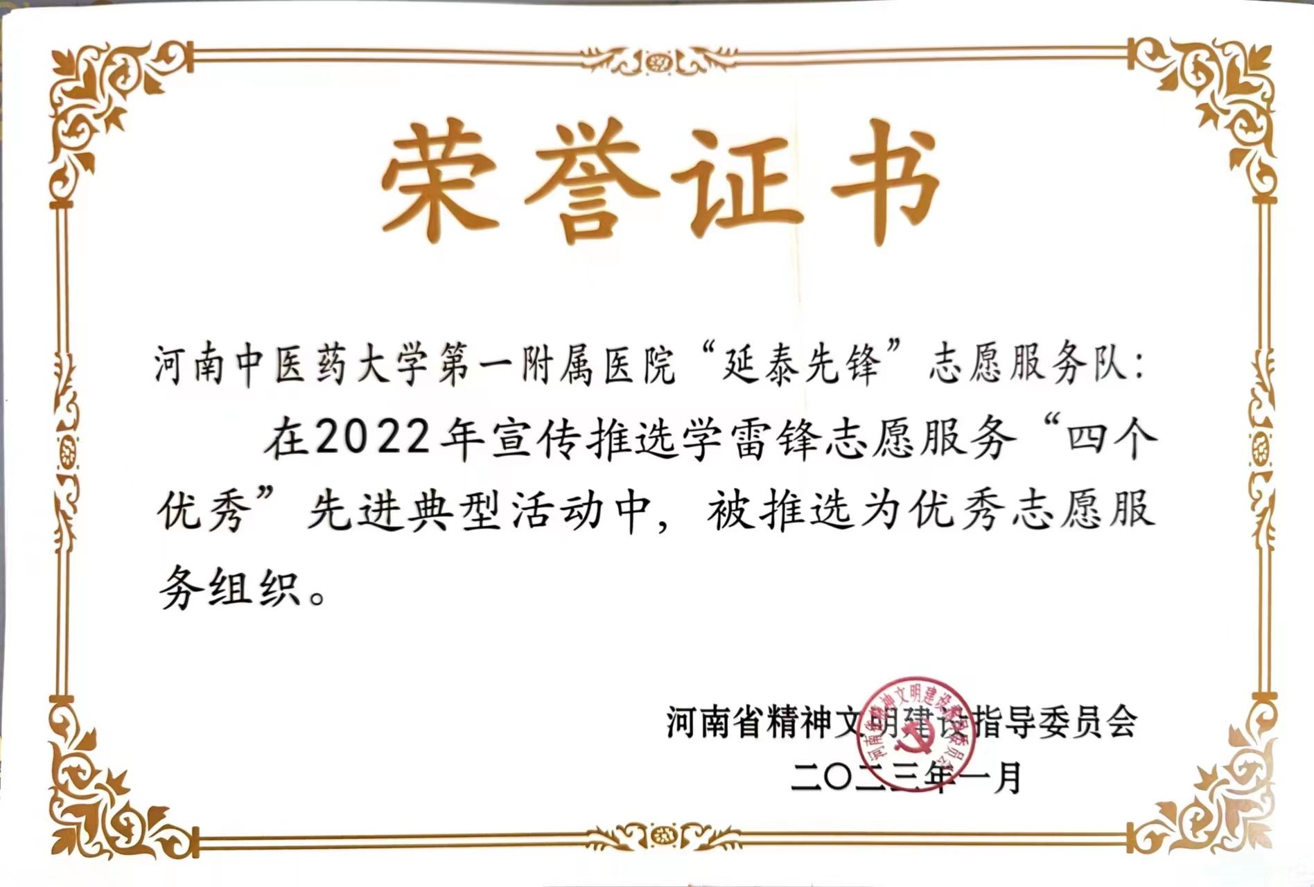 第一附属医院“延泰先锋”志愿服务队荣获优秀志愿服务组织