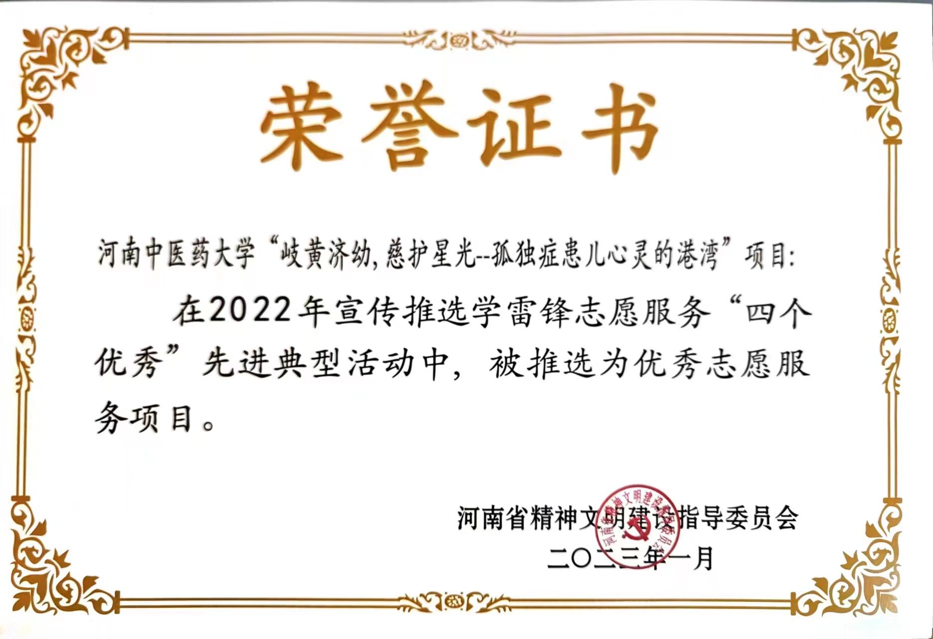 “岐黄济幼,慈护星光——孤独症患儿心灵的港湾”志愿服务项目荣获优秀志愿服务项目