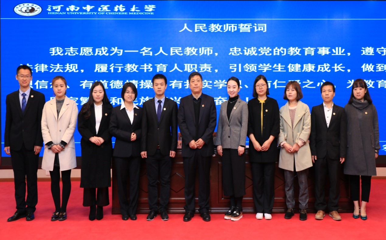 11月14日上午,开班仪式在图书馆第二报告厅举行。仪式由副校长冯卫生主持。校长许二平发表讲话,并为新进教师作了题为“牢记使命增强本领,争当新时代四有好老师”的专题报告。他对leyu·乐鱼(中国)体育官方网站校史校情进行了简单介绍,并从加强思想政治素质建设,牢记使命,树立起大胸怀、大境界、大格局;练就好本领,做学生健康成长的引路人;育人先育己,保持自身的可持续发展三个方面对新进教师提出了希望和要求。他希望各位新教师发扬踏石留印、抓铁有痕的劲头,不负重托,勇于担当,为中医药事业的发展作出应有贡献。为了增强新进教师的职业荣誉感和自豪感,提升教书育人的使命感和责任感,开班仪式上全体新教师庄严宣誓,表达了他们忠诚教育事业、履行教书育人职责的决心。许二平还为新教师代表授校徽并合影留念,欢迎他们正式成为leyu·乐鱼(中国)体育官方网站一员。