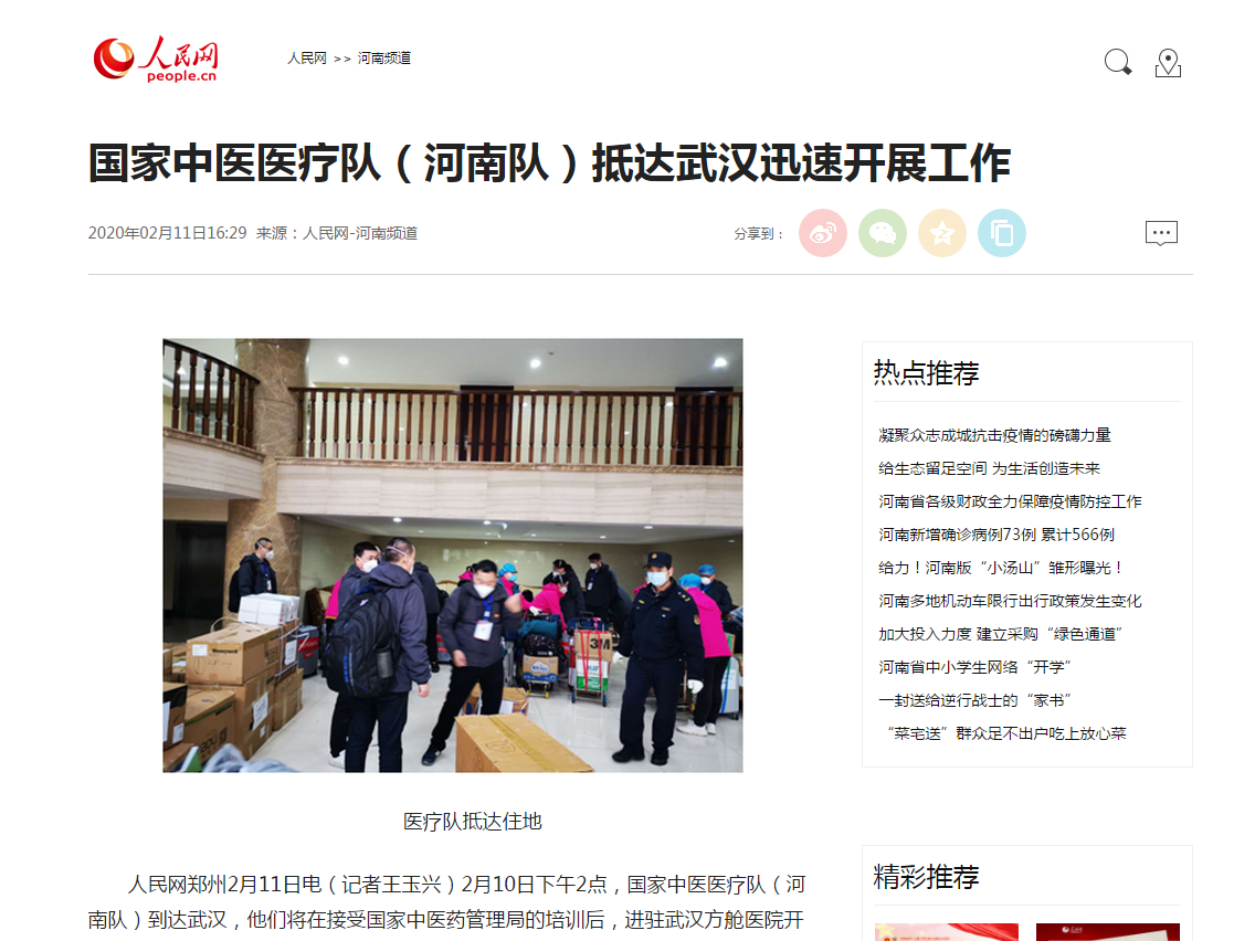 编者按:2020年2月11日,人民网对leyu·乐鱼(中国)体育官方网站援助武汉国家中医医疗队(河南队)抵达武汉后迅速开展工作进行报道。现将全文刊发如下: