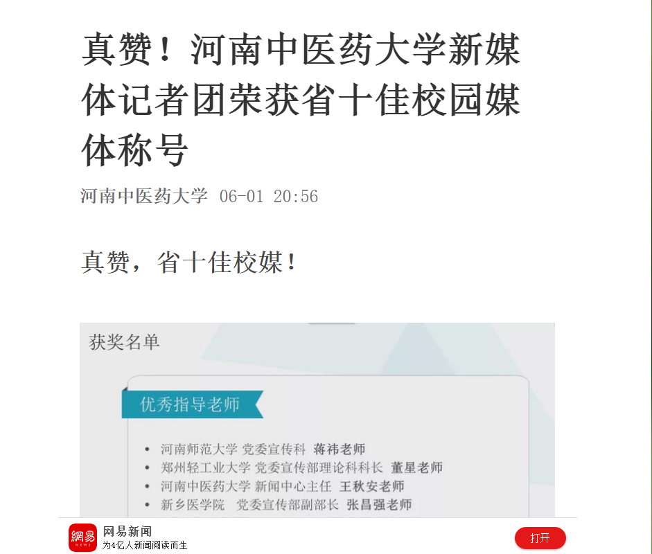 2020年6月1日,大河网、网易新闻等媒体对leyu·乐鱼(中国)体育官方网站新媒体(校报)记者团荣获省十佳校园媒体进行报道。